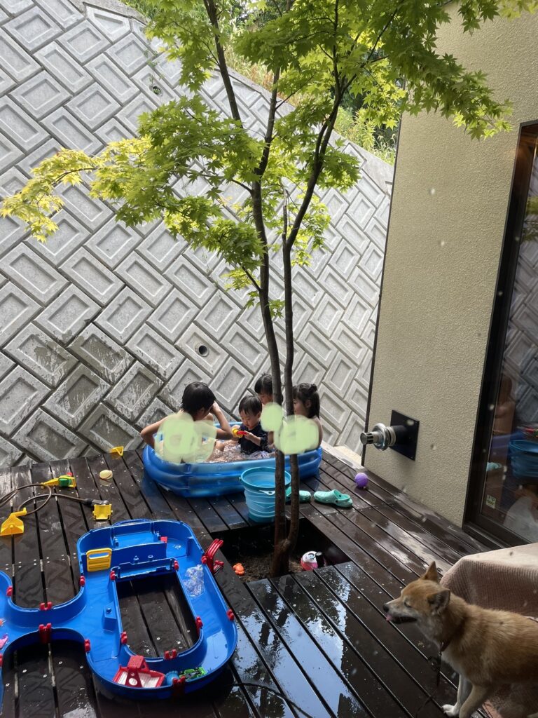 ②お風呂で水遊び(①の後、足の汚れ落としを兼ねて、デッキのプールで遊んだ後…)
