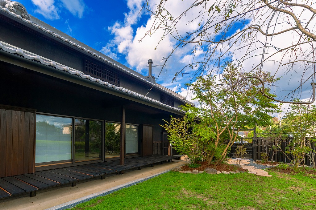 間続きの座敷の前にあるものは、縁側でなくウッドデッキです。現代の生活にマッチした設備を配して、渋くも美しく再生された純日本家屋と、その前に広がる和風の庭を柔らかく繋ぐ、現代版の縁側となっているのです。