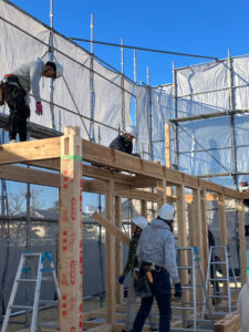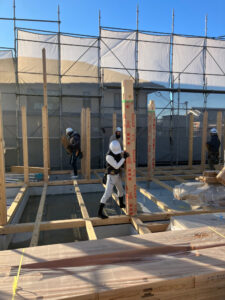 上棟作業では、基礎の上に施工された土台に柱が立っていきます。