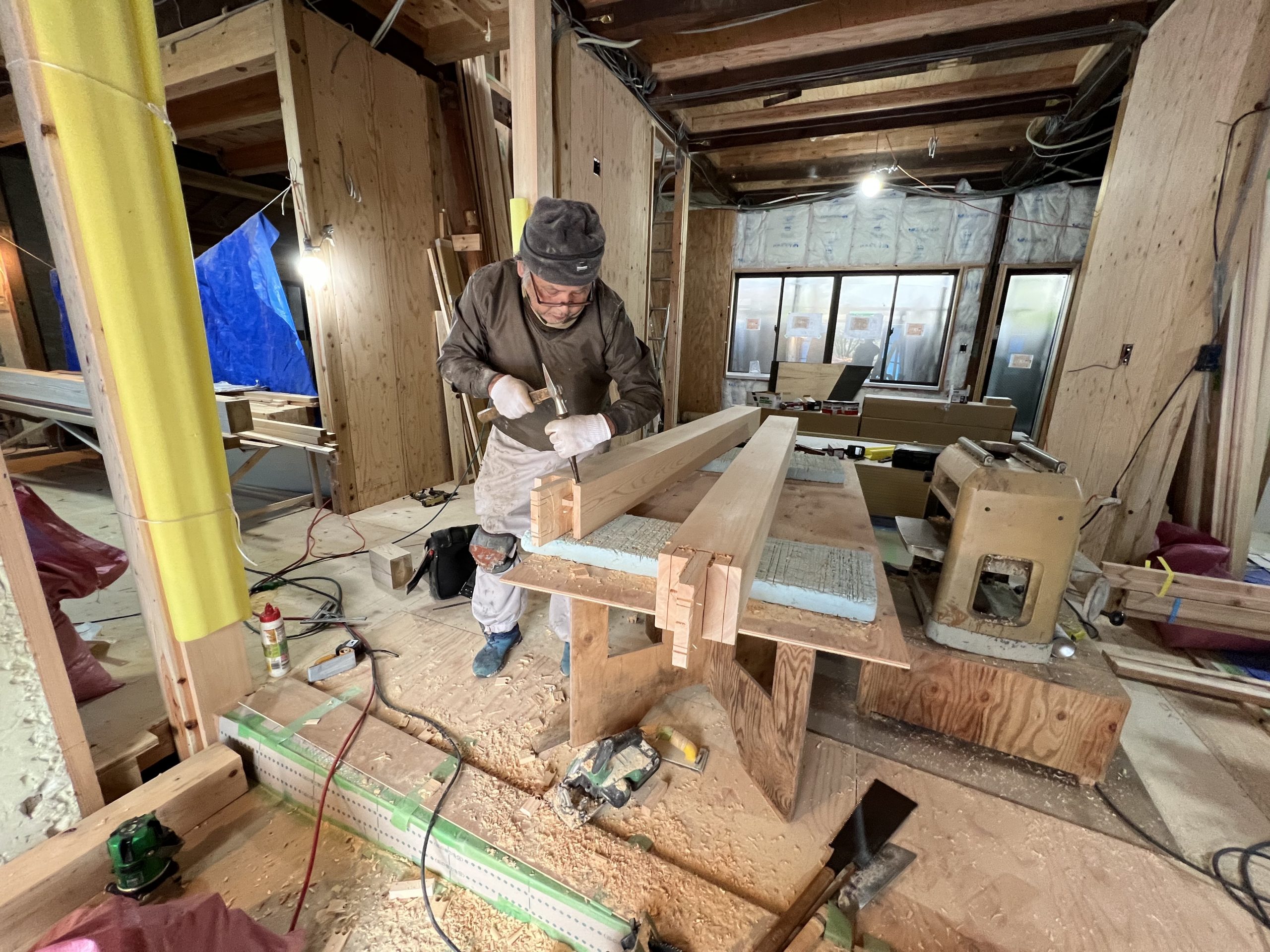 接合部分の加工をしています。丸ノコで刃をいれ、ノミと槌で丁寧に削っています。