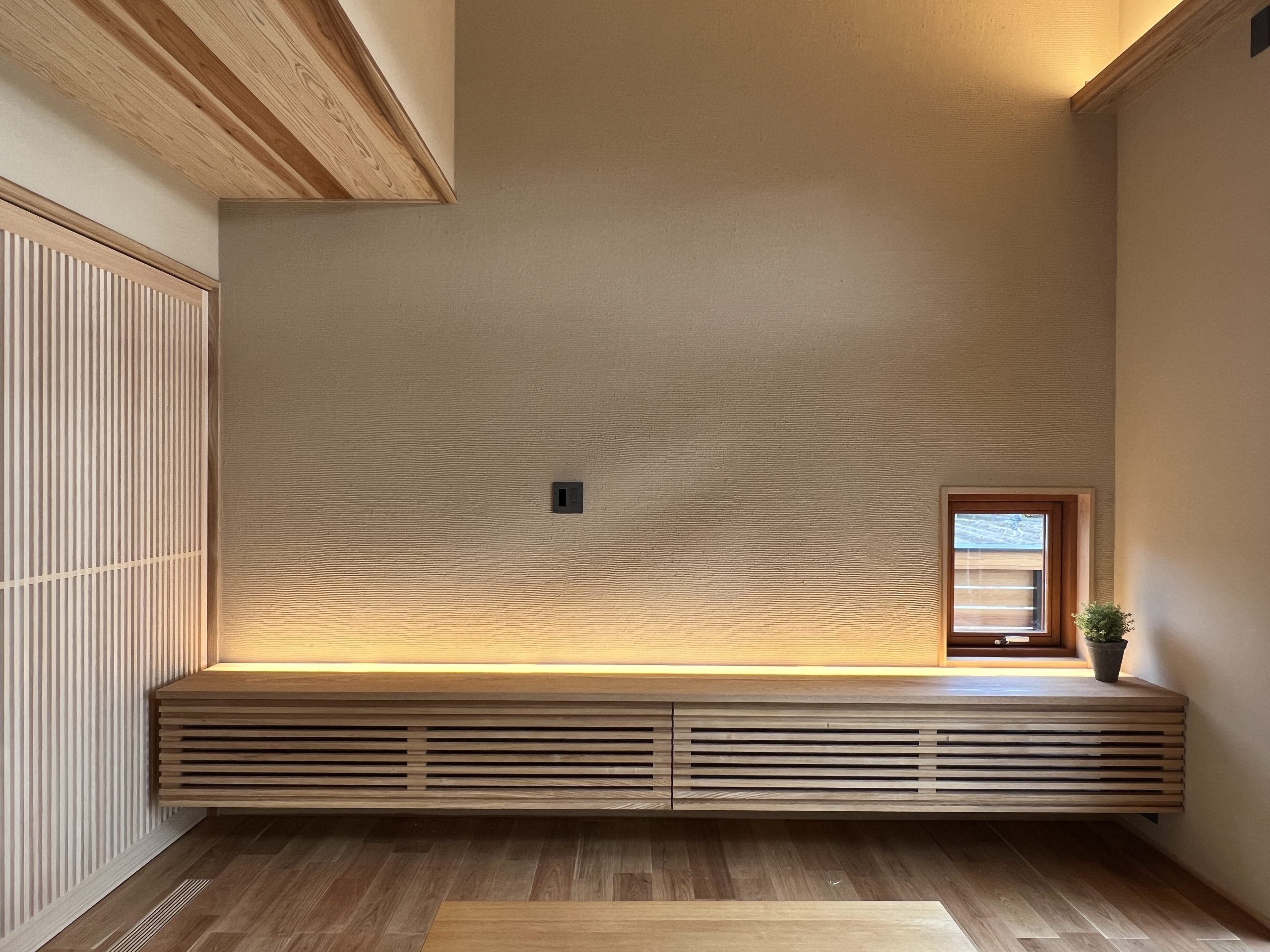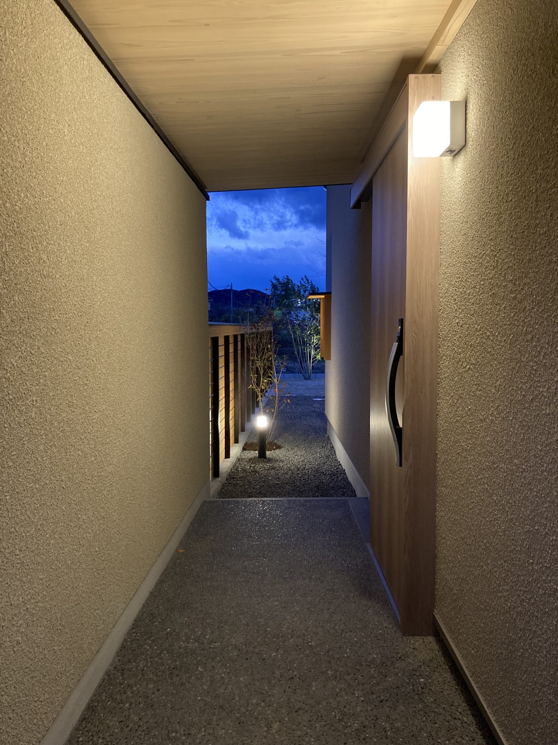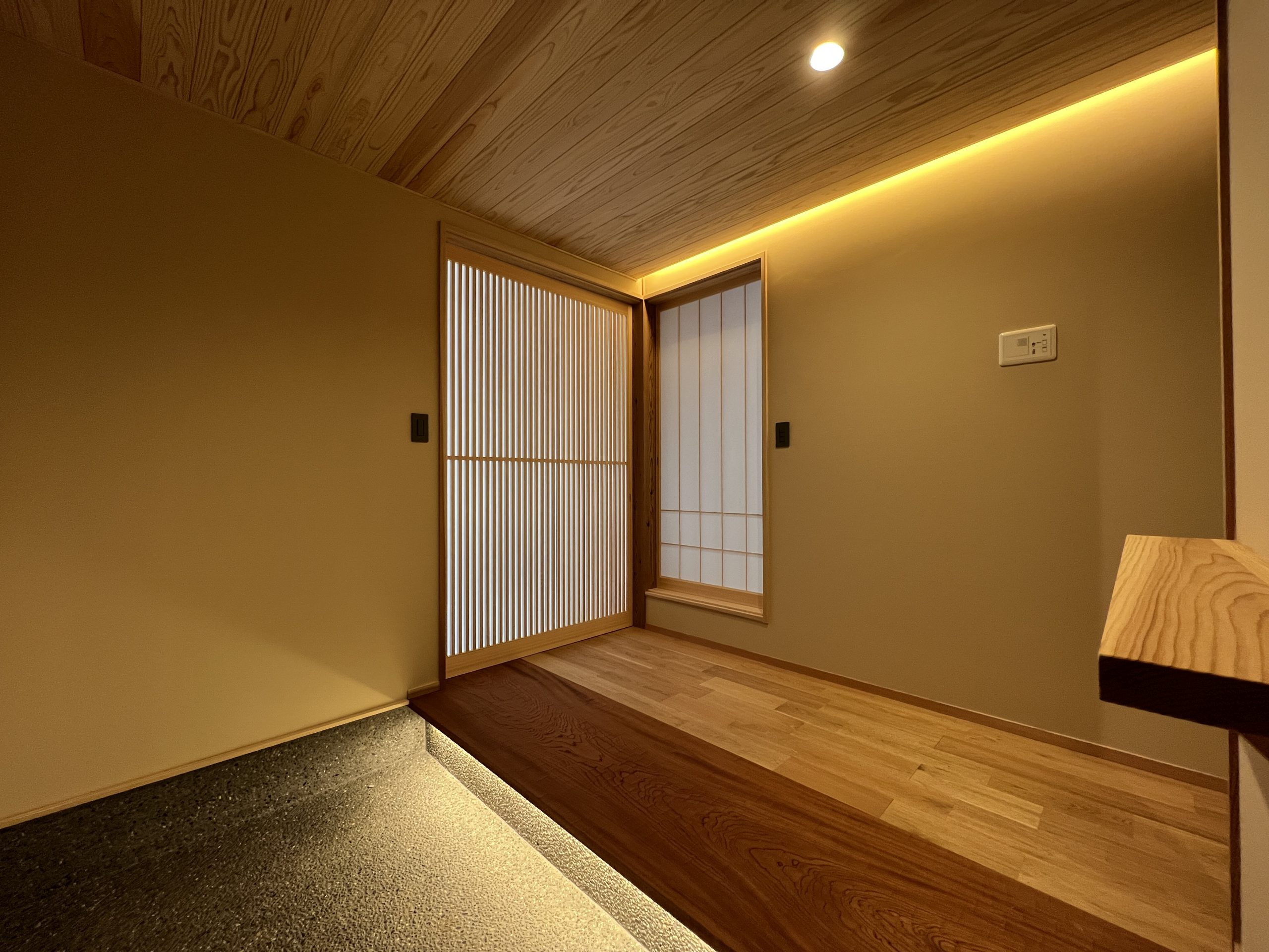 間接照明による演出や土間部分を洗出しにし、式台は欅のなぐりなど素材の良さを感じさせる玄関になりました。