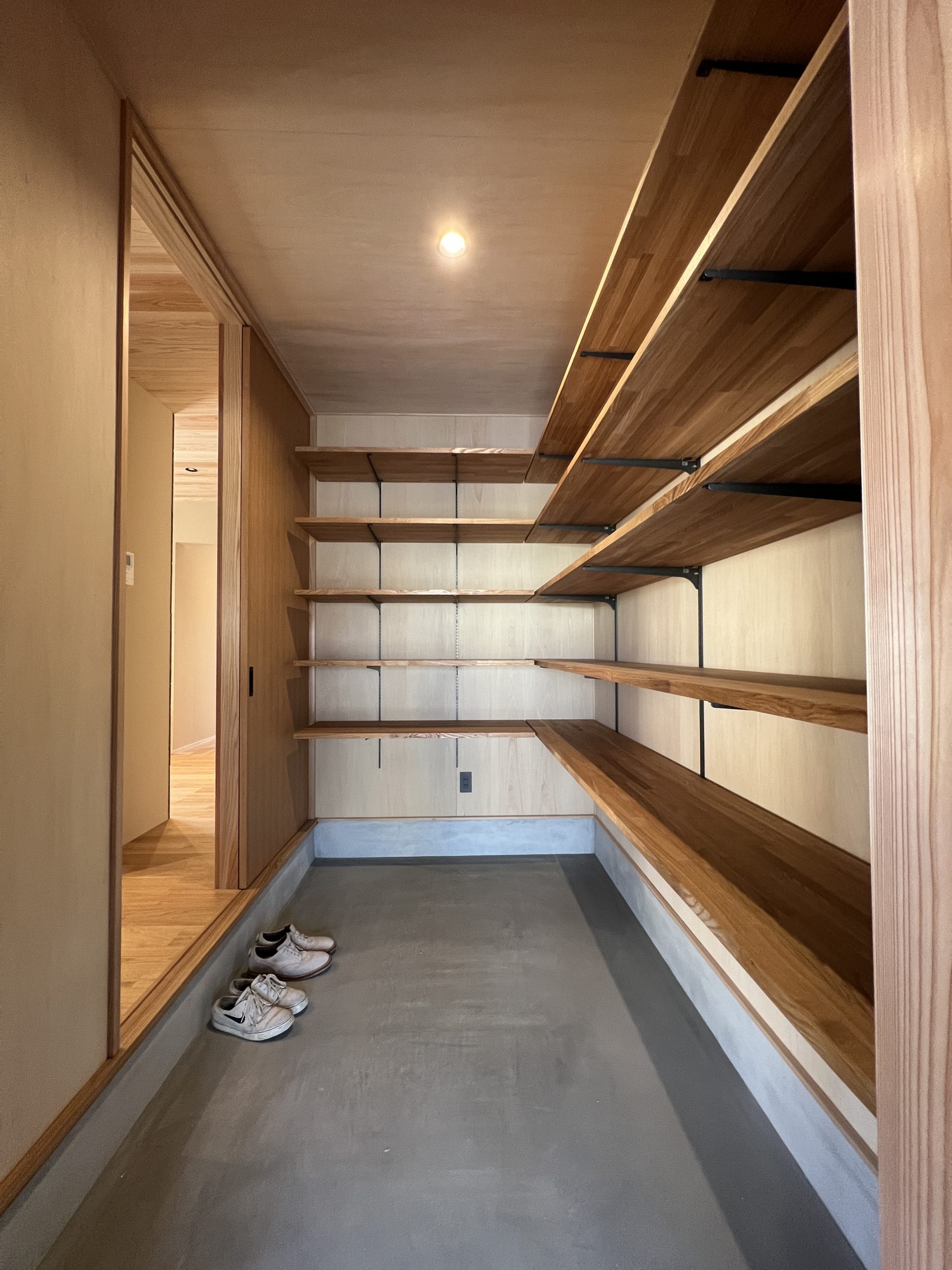 キッチン横には外部収納の土間空間を配置し、勝手口からガレージへとつながります。