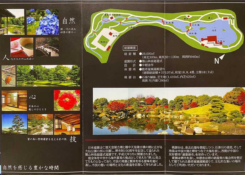 「庭全体を中世から海外貿易の拠点として栄えた「堺」に見立てたものとなっており、市民の発展と繁栄を祈る意味を庭に表し、市民の憩いの場所と文化の創造を目指して作られました」とあります。