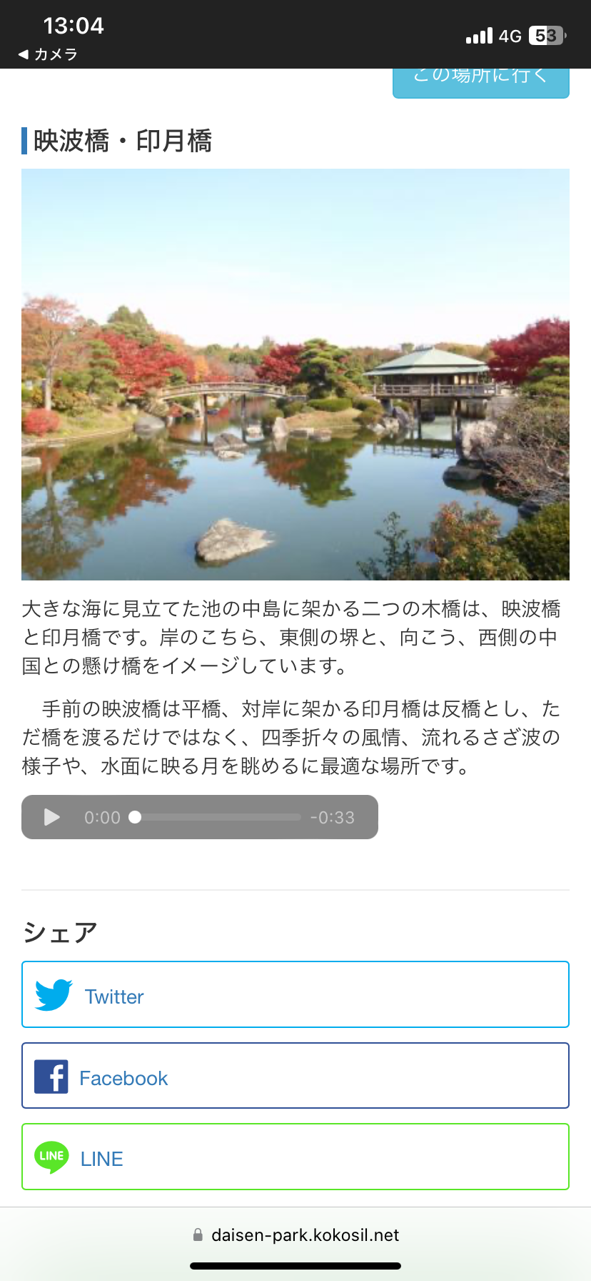 たとえば、橋のたもとにはこのような看板があり、その柱にはQRコードが!。スマホをかざすと、下記のような画面が表示されました。