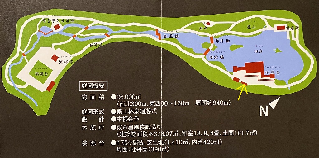 矢印で示した黄色の楕円で囲ってあるところが、日本庭園です。
