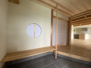 立派な門を抜けると玄関で可愛らしい丸窓が迎えてくれます。この丸窓の向こう側はLDKと一体の和室になっていて、生活空間を広げるとともに、建具を閉め切れば6畳間の落ち着いた空間にもなります。
