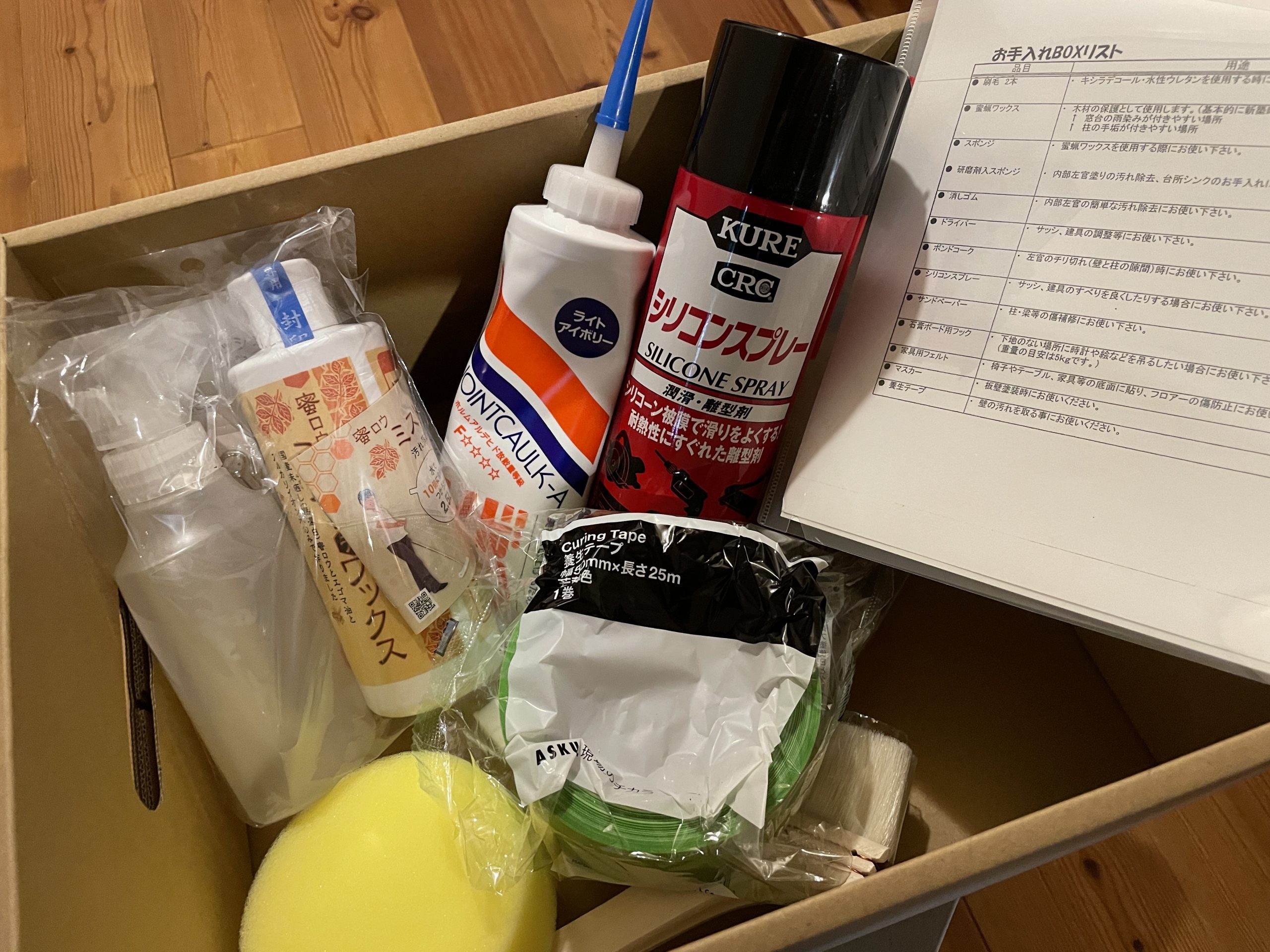 蜜蠟ワックスはコアー本社でもご購入いただけますが、養生テープ含めその他メンテナンスグッズはお引き渡し時に「メンテナンスボックス」としてお渡しさせて頂いておりますので、現在お手入れをお考えの方は一度メンテナンスボックスをご活用ください!