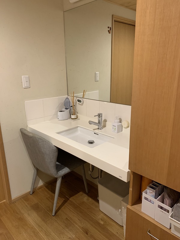 こちらは洗面台です。娘さん達も椅子に座ってゆったりメイクもできますね。