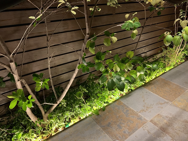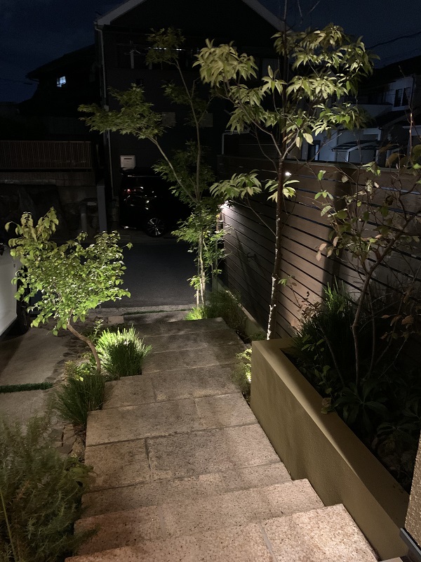 夜のM様邸の玄関です。玄関までのアプローチ、植栽にいい感じにライトが当たり、とても素敵でした。
