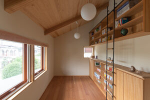 梯子を利用して出し入れするほど背の高い本棚。