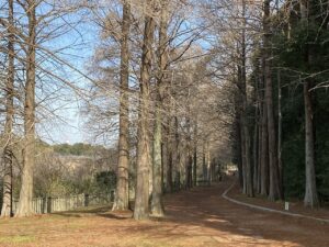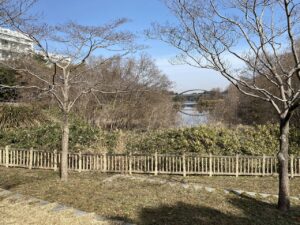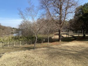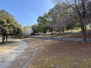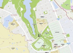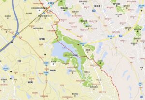 光明池の細くなった尾っぽ東側を、北に延びている園路をご覧ください。