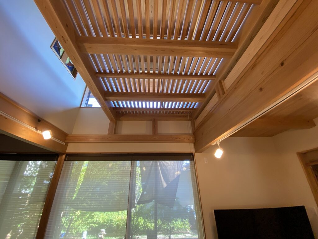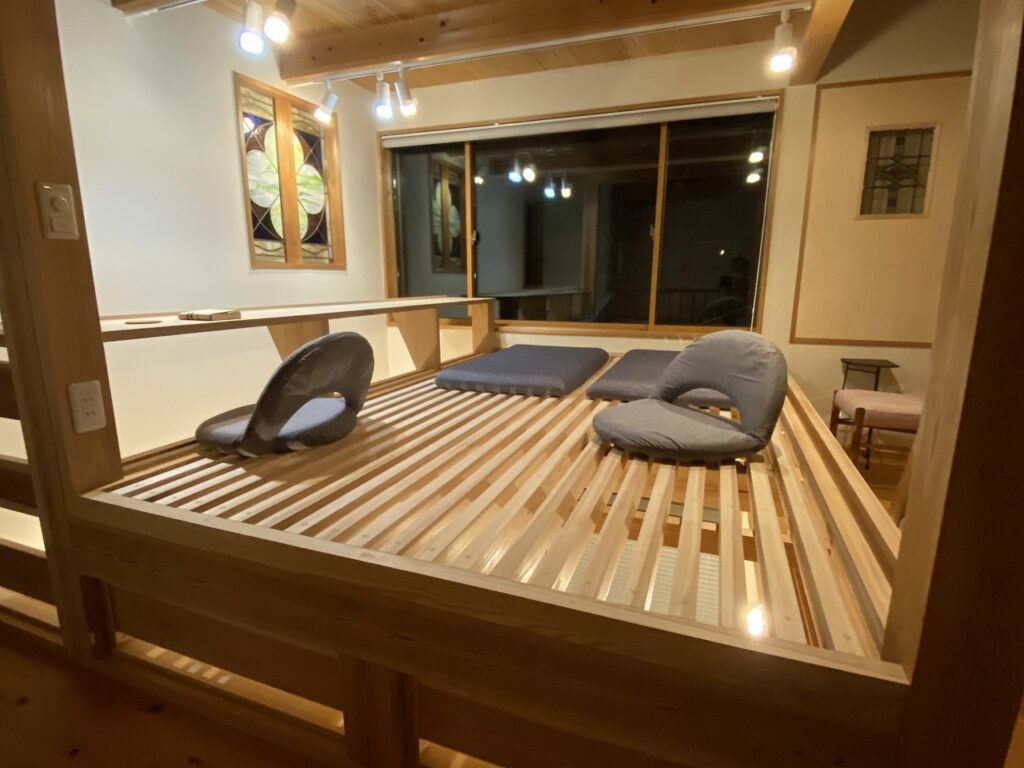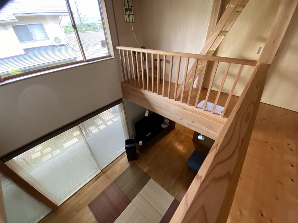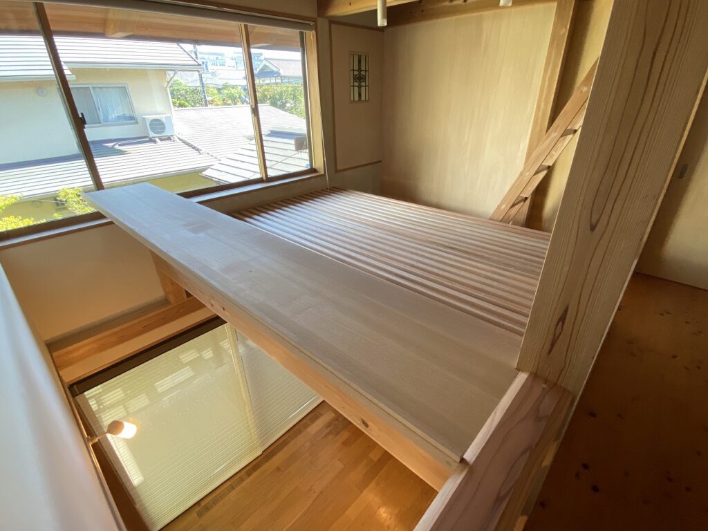 6帖分の広さがある吹き抜けの、4.5帖分をスノコ床にしました。残りの半間巾、広さで言うと1.5帖分が、吹き抜けとして残っているのですが、そこに面してテーブルを設置したのもF様のアイデア。吹き抜けに足を垂らして座ることができます。
