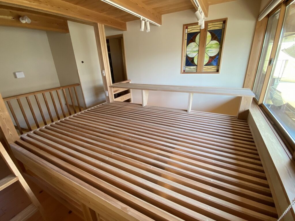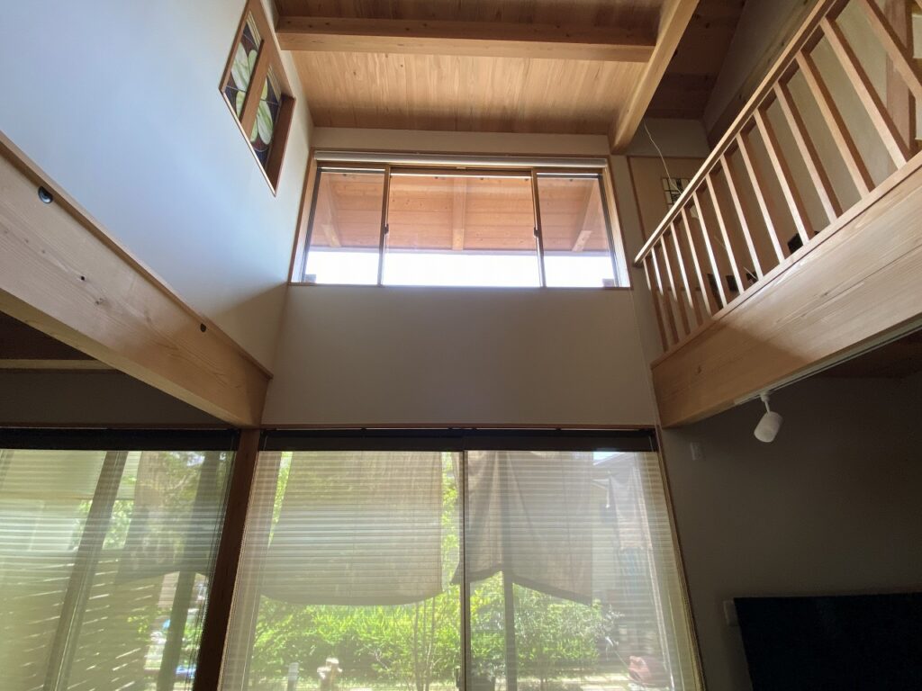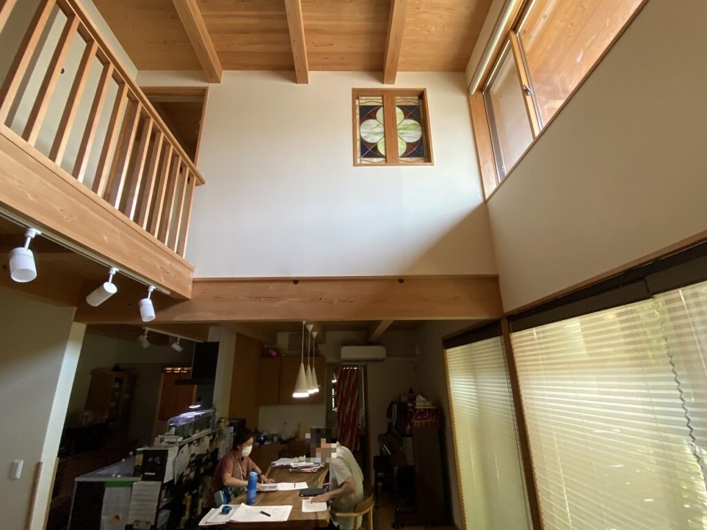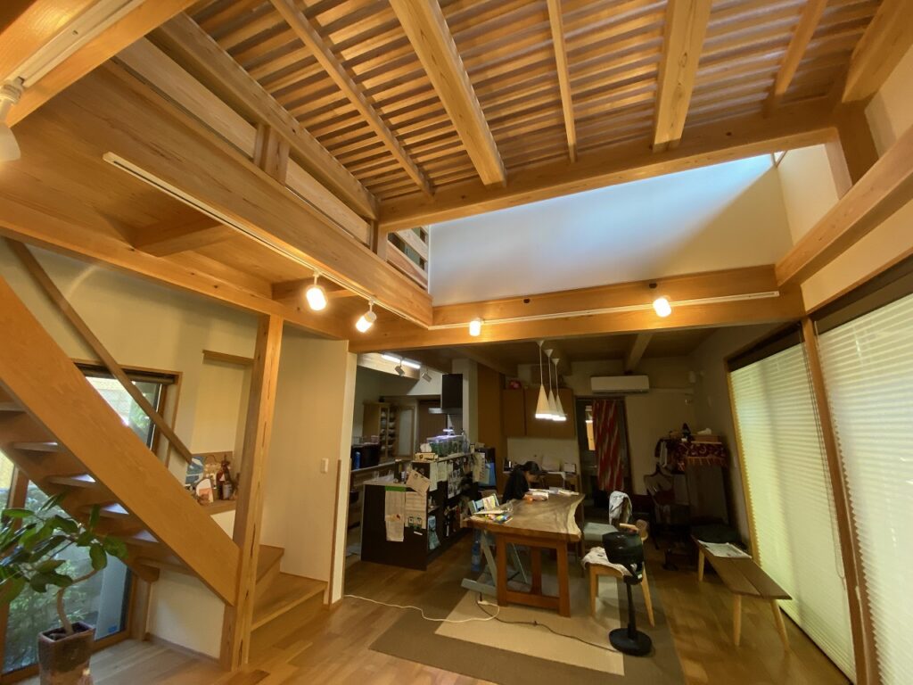 6帖分の広さがある吹き抜けの、4.5帖分をスノコ床にしました。残りの半間巾、広さで言うと1.5帖分が、吹き抜けとして残っているのですが、そこに面してテーブルを設置したのもF様のアイデア。吹き抜けに足を垂らして座ることができます。
