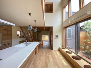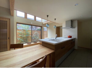 吹抜けから明るい光が降り注ぎ、緑に癒され、心地よいキッチンになります。