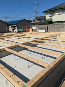 べた基礎が完成して、引き続き基礎の上にヒノキの土台を敷きます。