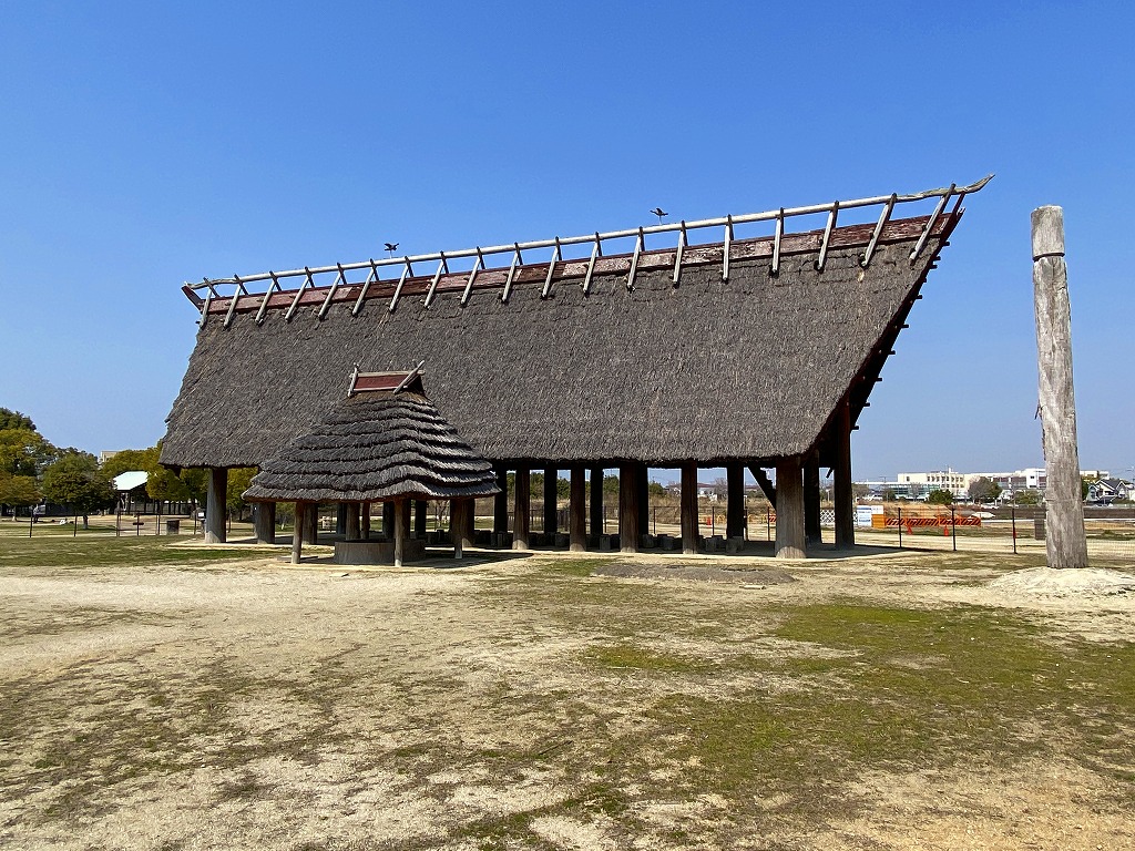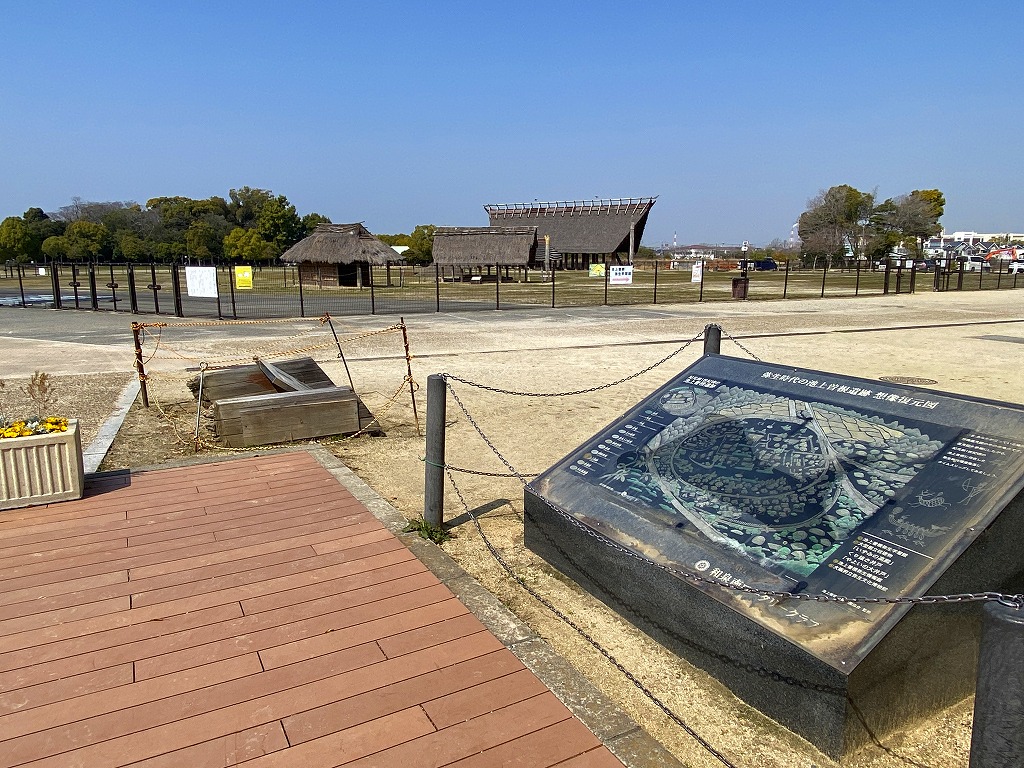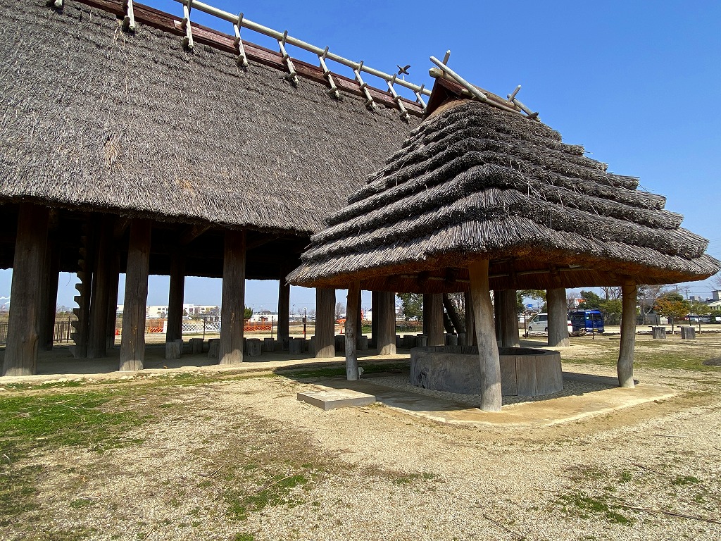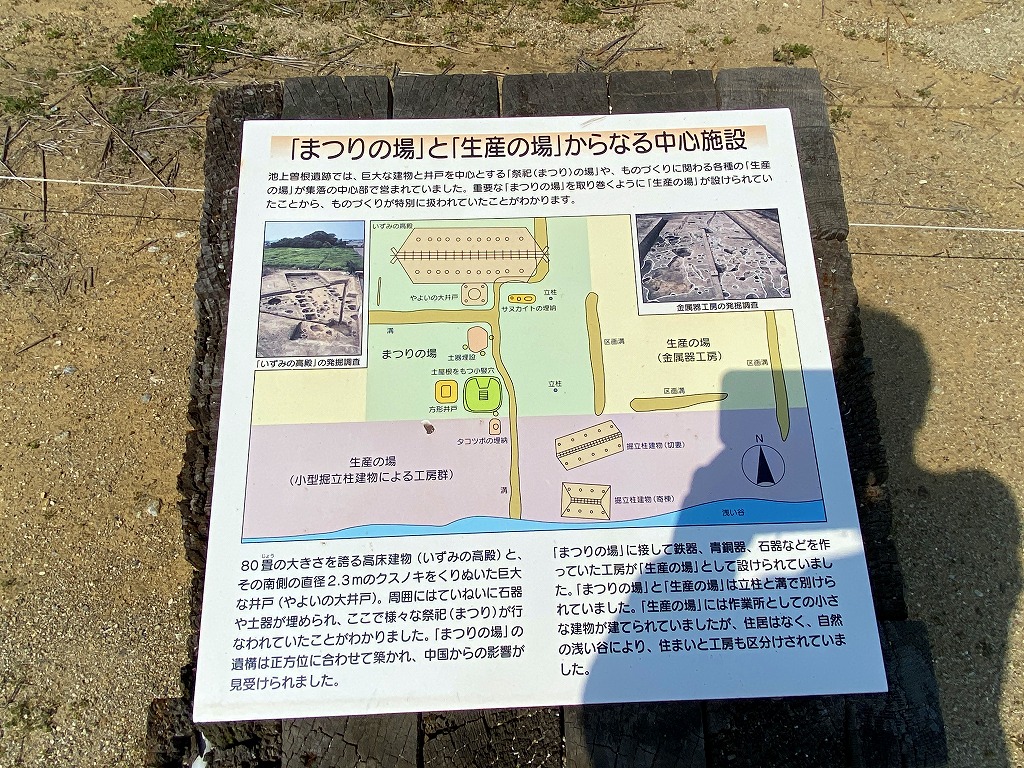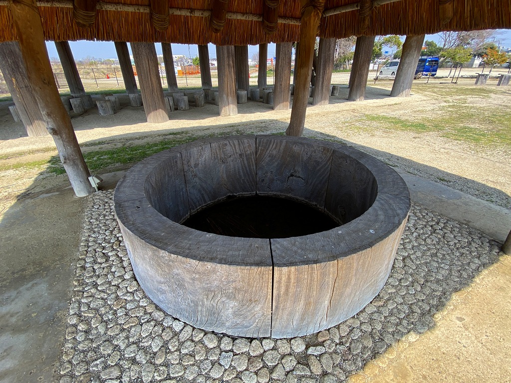 『80畳の大きさを誇る高床建物(いずみの高殿)とその南側の直径2.3mのクスノキをくりぬいた巨大な井戸(やよいの大井戸)。周囲にはていねいに石器や土器が埋められ、ここで様々な祭祀(まつり)が行われていたことがわかりました。「まつりの場」の遺構は正方位に合わせて築かれ、中国からの影響が見受けられました』と、説明版にありました。