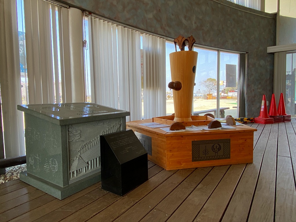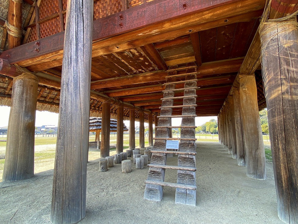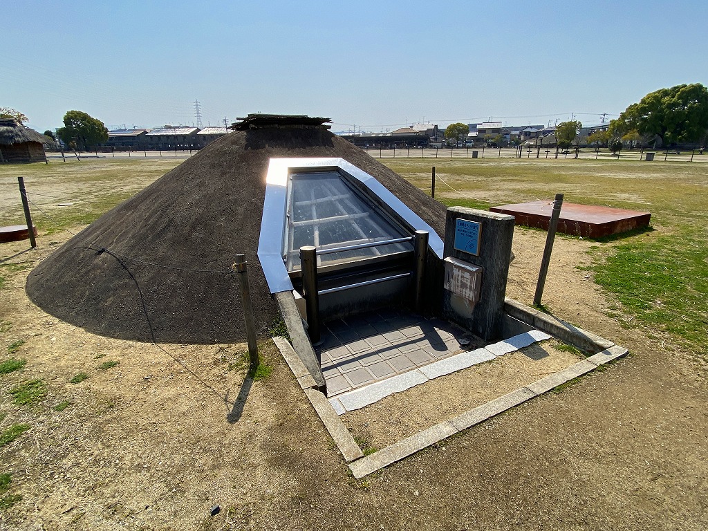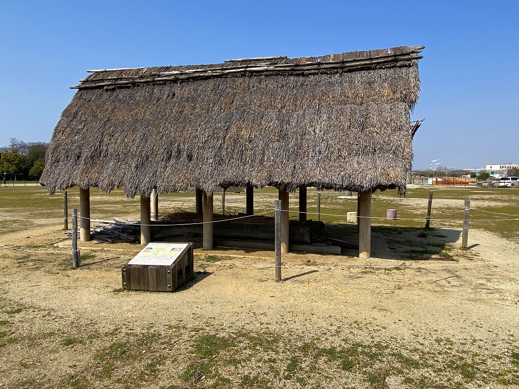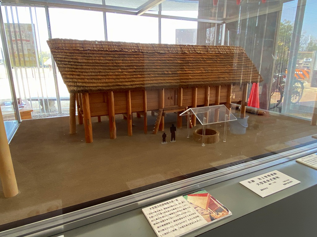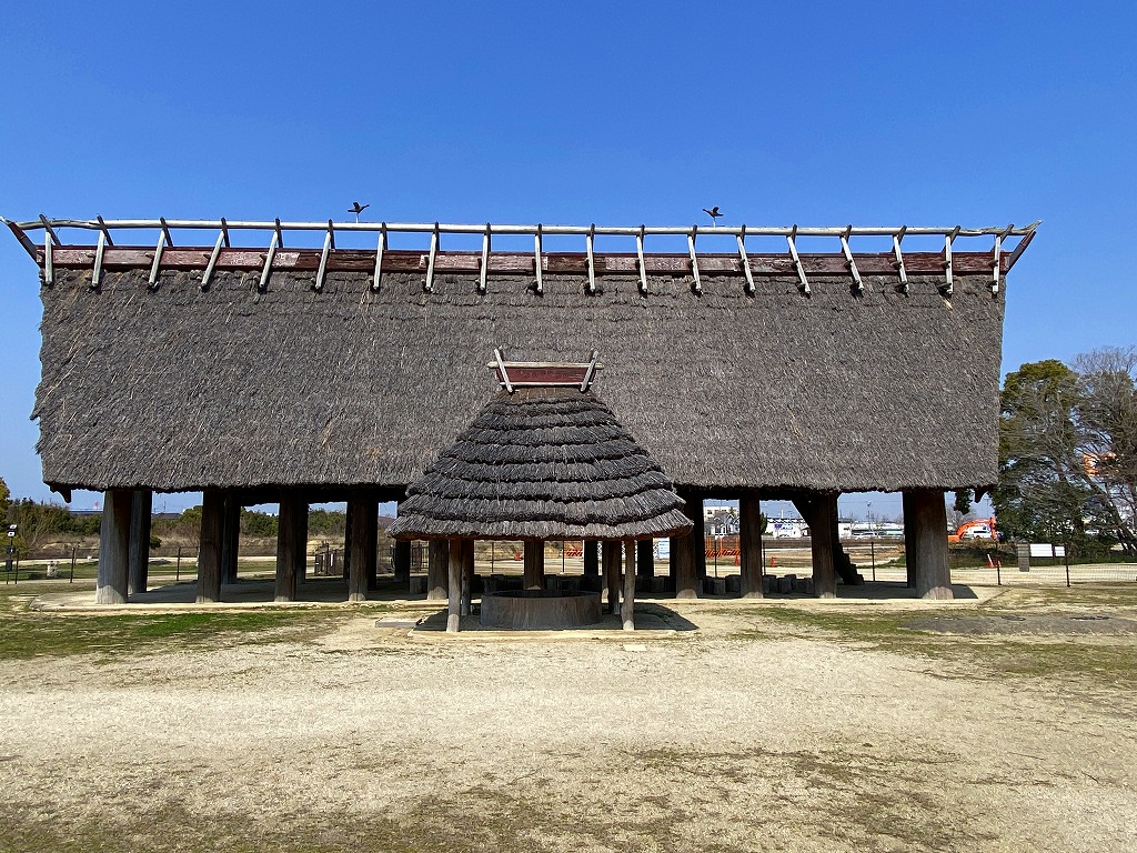 『80畳の大きさを誇る高床建物(いずみの高殿)とその南側の直径2.3mのクスノキをくりぬいた巨大な井戸(やよいの大井戸)。周囲にはていねいに石器や土器が埋められ、ここで様々な祭祀(まつり)が行われていたことがわかりました。「まつりの場」の遺構は正方位に合わせて築かれ、中国からの影響が見受けられました』と、説明版にありました。