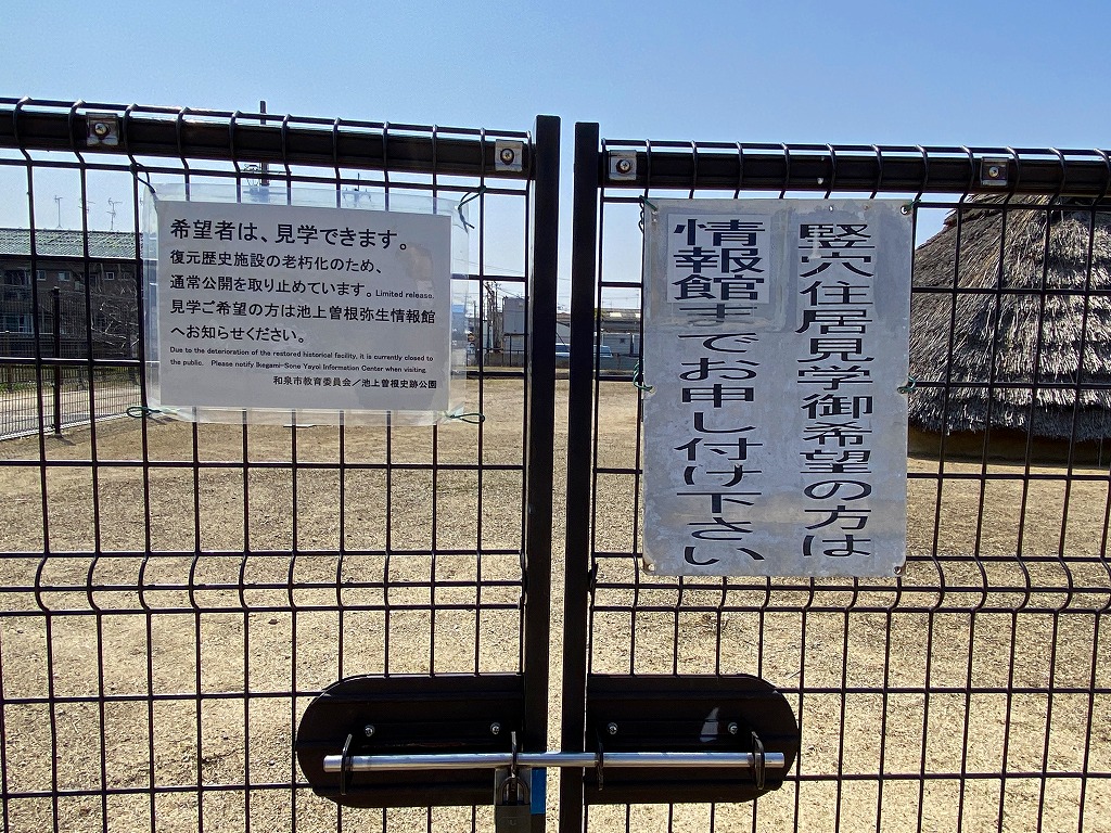 「復元歴史施設の老朽化のため、通常公開を取り止めています。見学ご希望の方は池上曽根情報館へおしらせください」という事になっているようです。遠方から見るだけにとどめました。