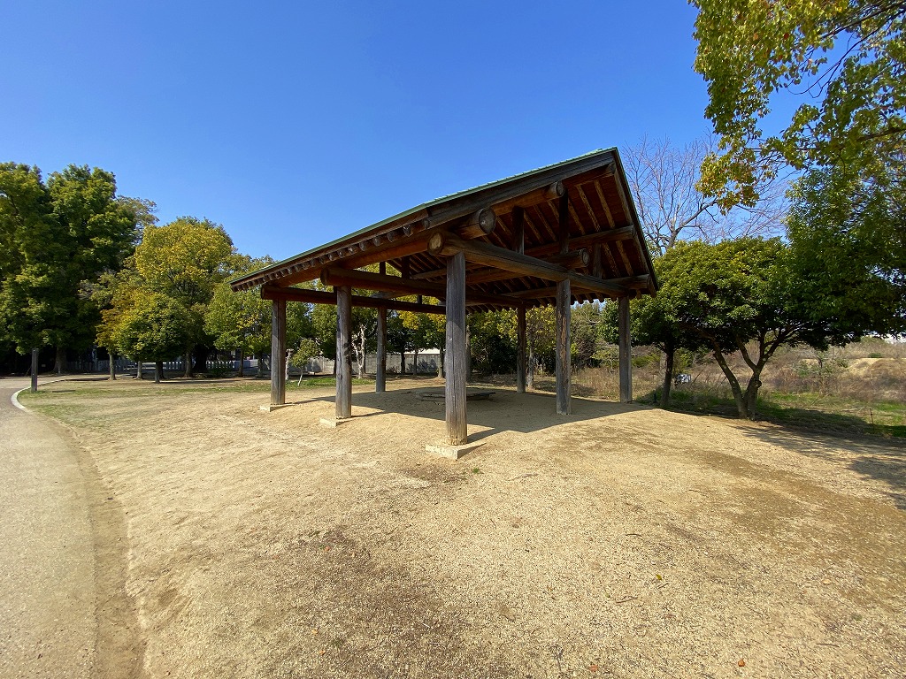 東屋も、遺跡の復元建物に雰囲気を合わせた丸太組の建物でした。が、これも中央のベンチの一部が壊れたまま放置されている状況でした、残念。