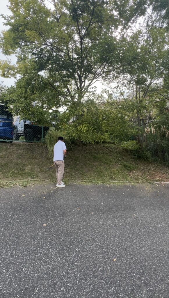 アプローチの草刈りや、植栽の剪定など、全社員総出で作業に取り組みました。