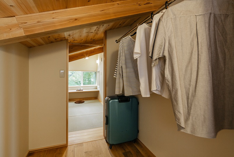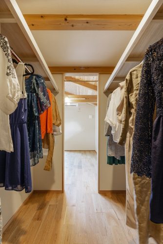 コアーのお家は天井を貼らずに梁を表す設計を取り入れているため、1階と比べると階高の低い2階でも、広々としたウォークインクローゼットを設けることが可能です。