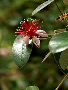 今回はフェイジョアという庭木を紹介させて頂きます。ウルグアイ、パラグアイ、ブラジル南部など南米を原産とし、冬も葉が落ちない常緑樹です。別名アナナスガヤバと言うそうです。果樹としても栽培される実はパイナップルに似た香りがし、梨と桃をミックスしたような味がするそうです。