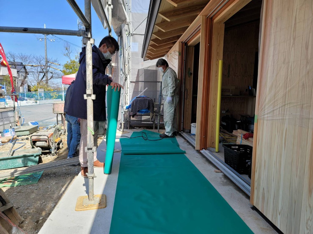 土間を養生する社員さん。本当に色んな人が携わってできた現場だと思います。