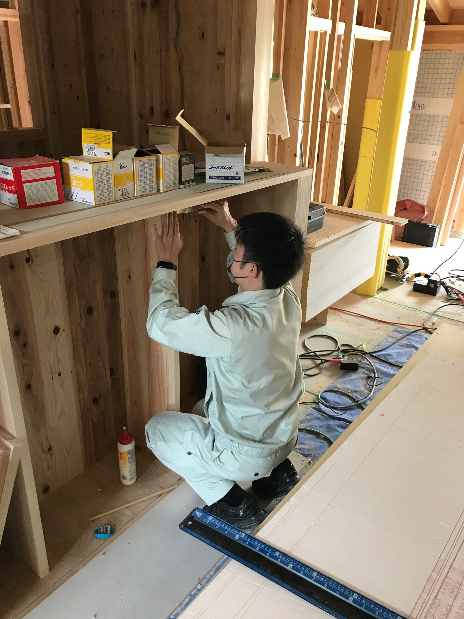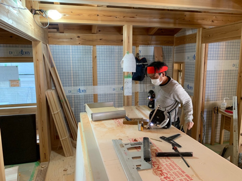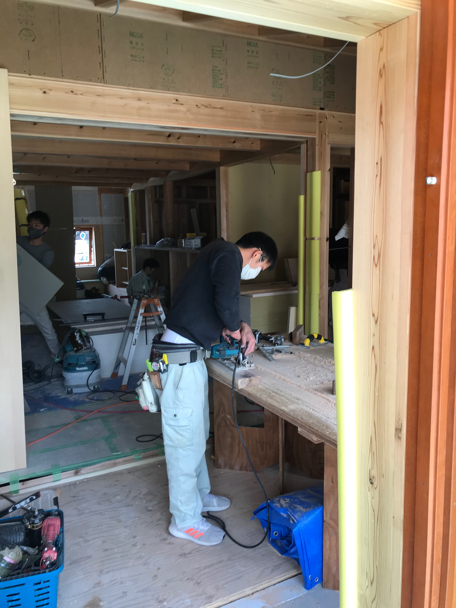 また、工事期間中だった4月には、今年2年目を迎えて益々頑張っている若手の社員さんたちも入社して、現場での研修期間中に大工さんらと一緒に作業をしてくれました。