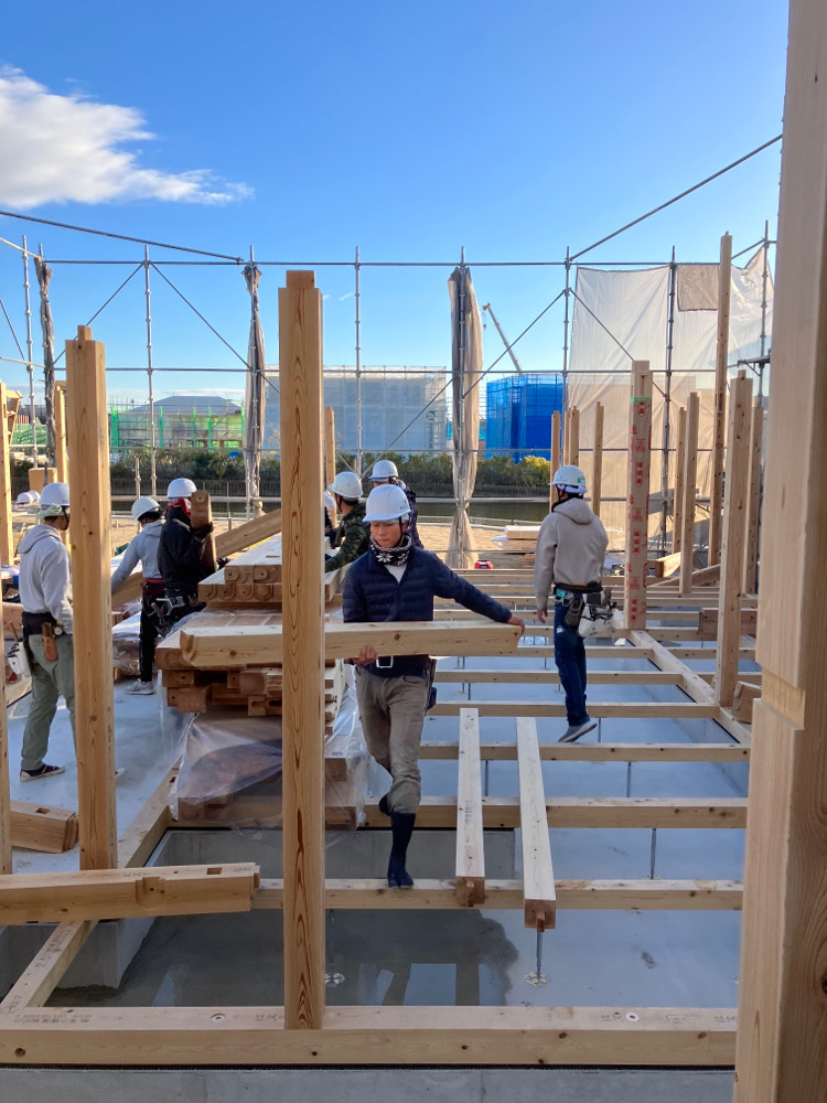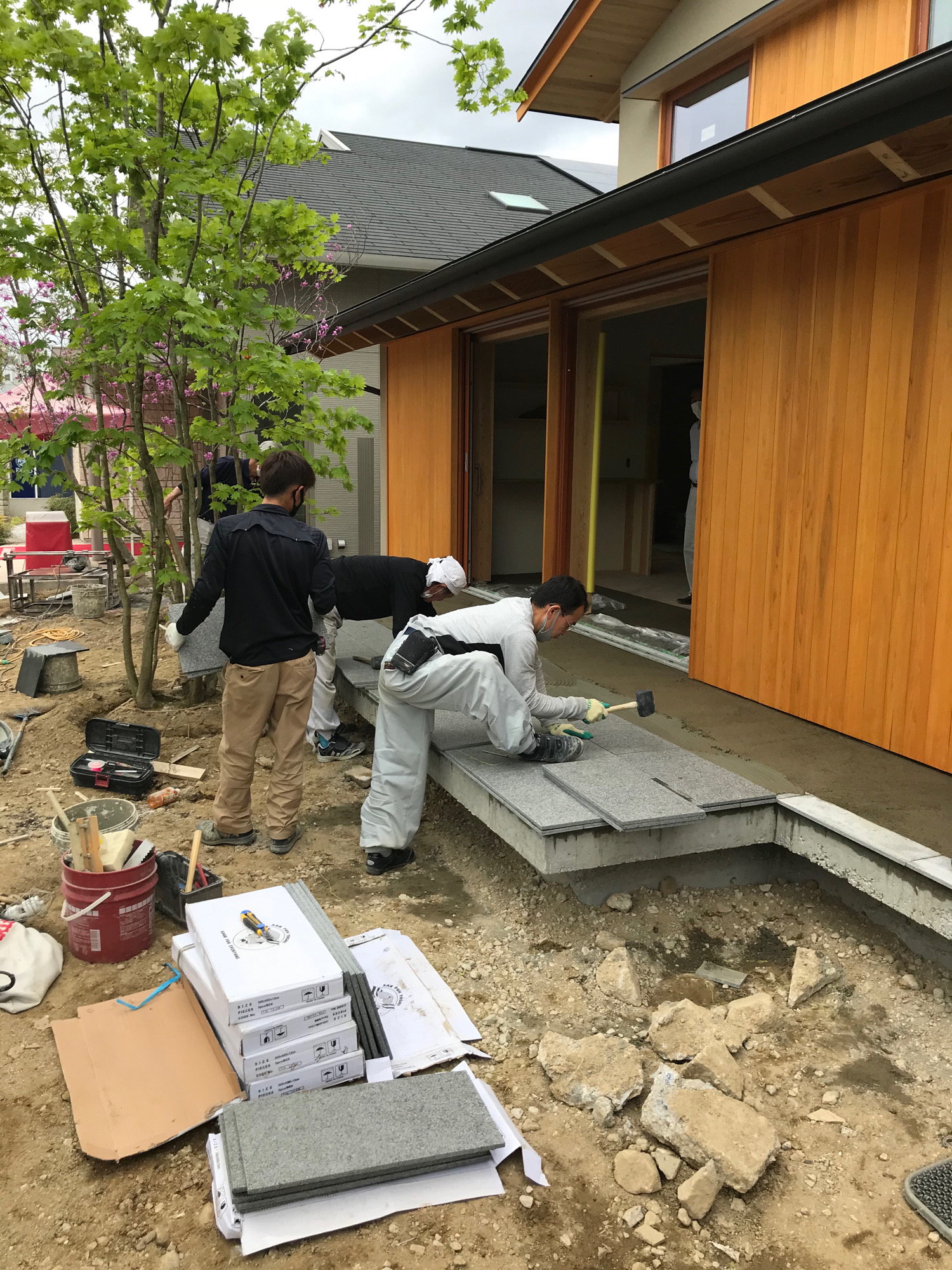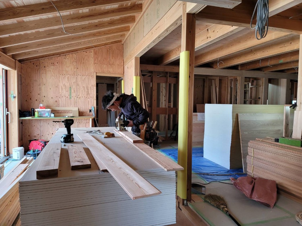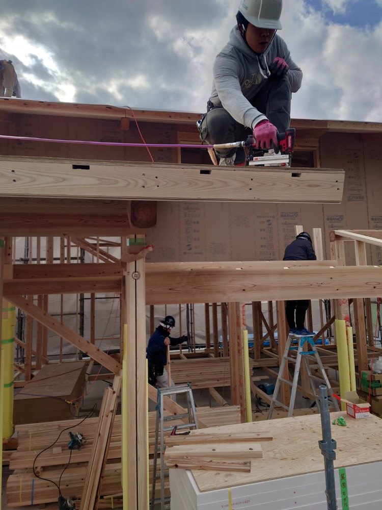 また、工事期間中だった4月には、今年2年目を迎えて益々頑張っている若手の社員さんたちも入社して、現場での研修期間中に大工さんらと一緒に作業をしてくれました。