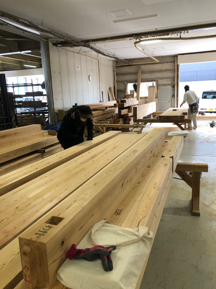 同時期に同じく美原区にあるコアー建築工房の倉庫で、他の新築物件と同様に大工さんらの手によって構造材が加工され、上棟までの準備が着々と進められていきました。