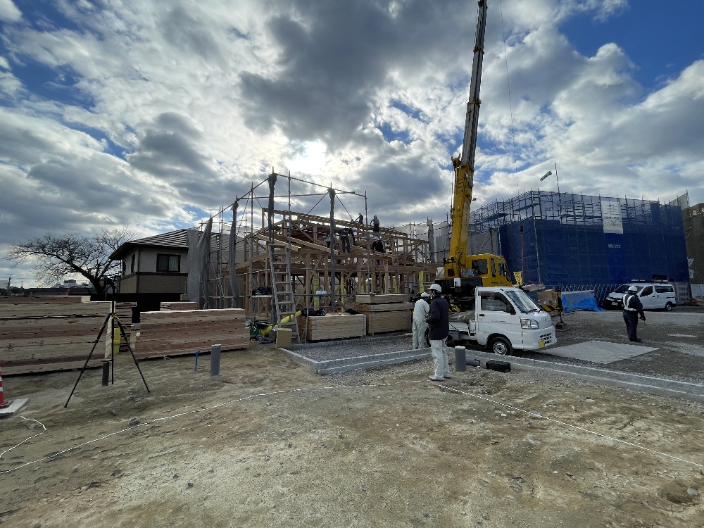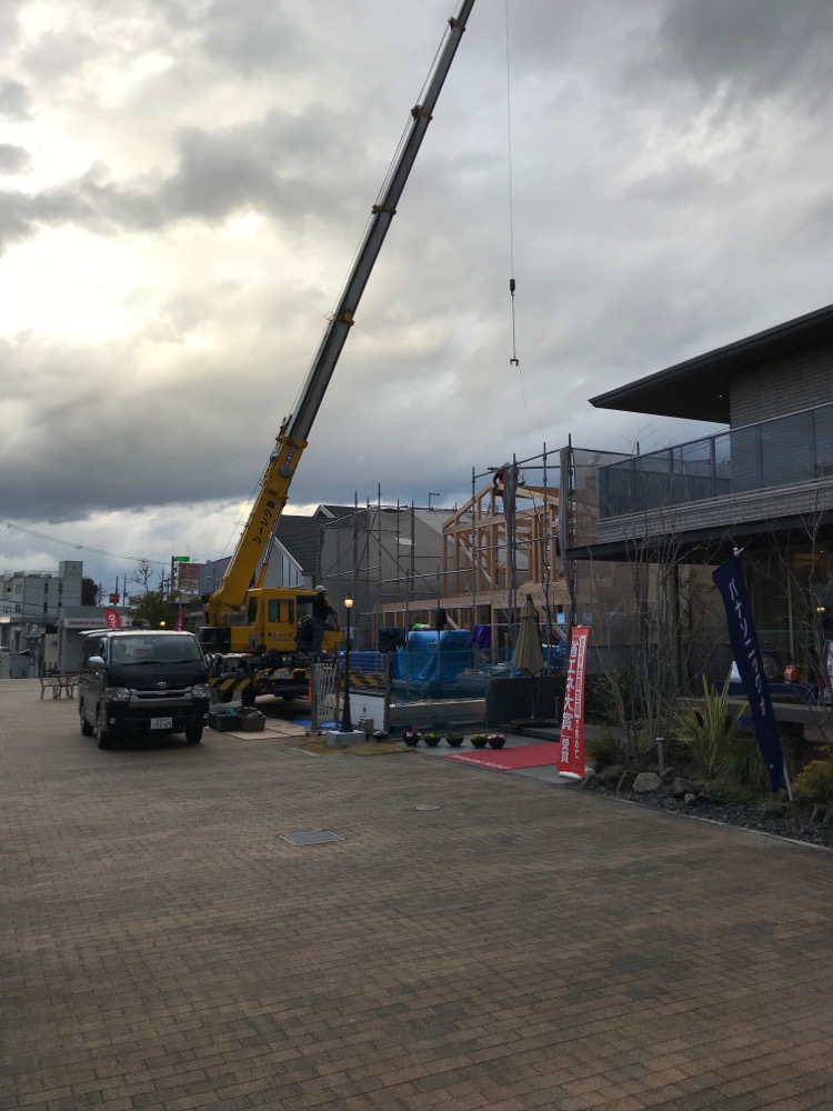 展示場は上棟ラッシュ。至る所にクレーンが停まり、作業をしています。