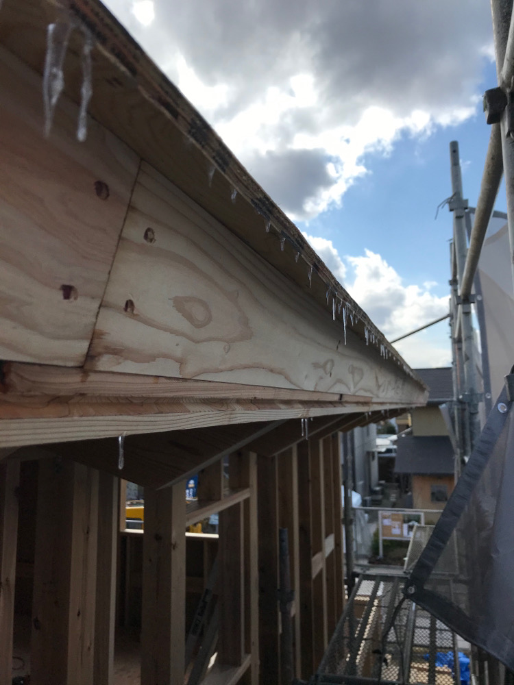 着工から約1ヶ月で上棟。氷柱ができるほど寒い季節でした。