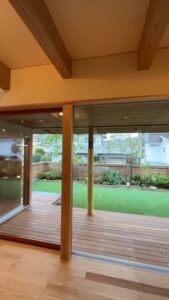 こちらはリビングから庭を見た様子。リビングのフローリングと同じ方向にウッドバルコニーが施工されているためか、中からみるとより一体感を感じられます。さらにウッドバルコニーの上は屋根が深く出しているため、雨でも全く濡れません。