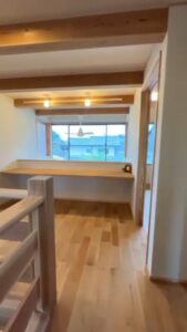 こちらのお家は南側が開けているため、吹抜けと各個室の南側は全面腰壁の窓が設けられています。写真にあるスタディコーナーから正面を見るとパノラマのように景色が切り取られています。この敷地を生かした窓の取り方は、圧倒されます。
