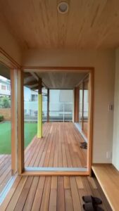 この写真は玄関から撮影したものですが、ここが外か中なのか。ウッドバルコニーをつなげることで、外とのつながりがより自然に感じられます。