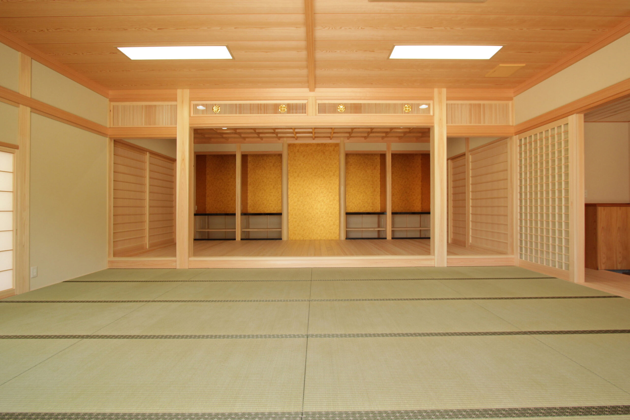 正面のガラリ戸を開けると繋がるお寺の内部は24帖の外陣を設けました。