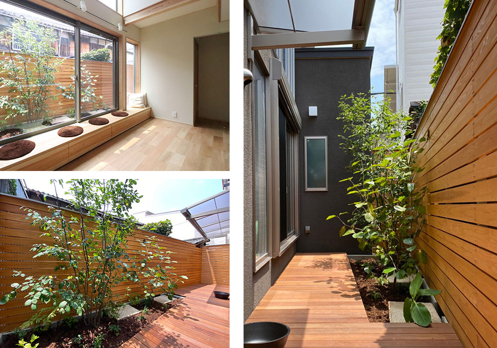 中庭のウッドデッキに面してあるベンチに腰掛けながら、