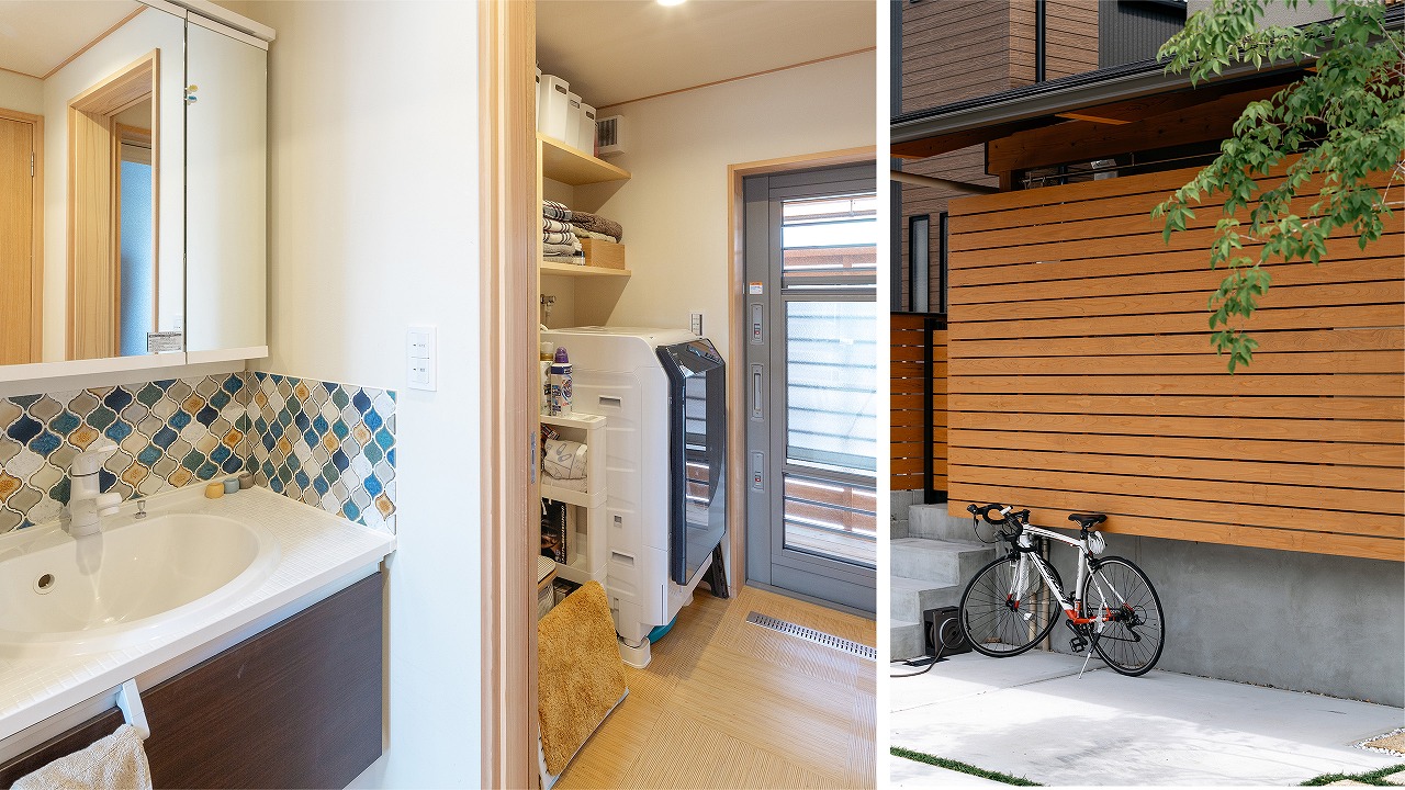 回遊できるアイランドのキッチンの近くに水廻りを設けて動線をスムーズに。