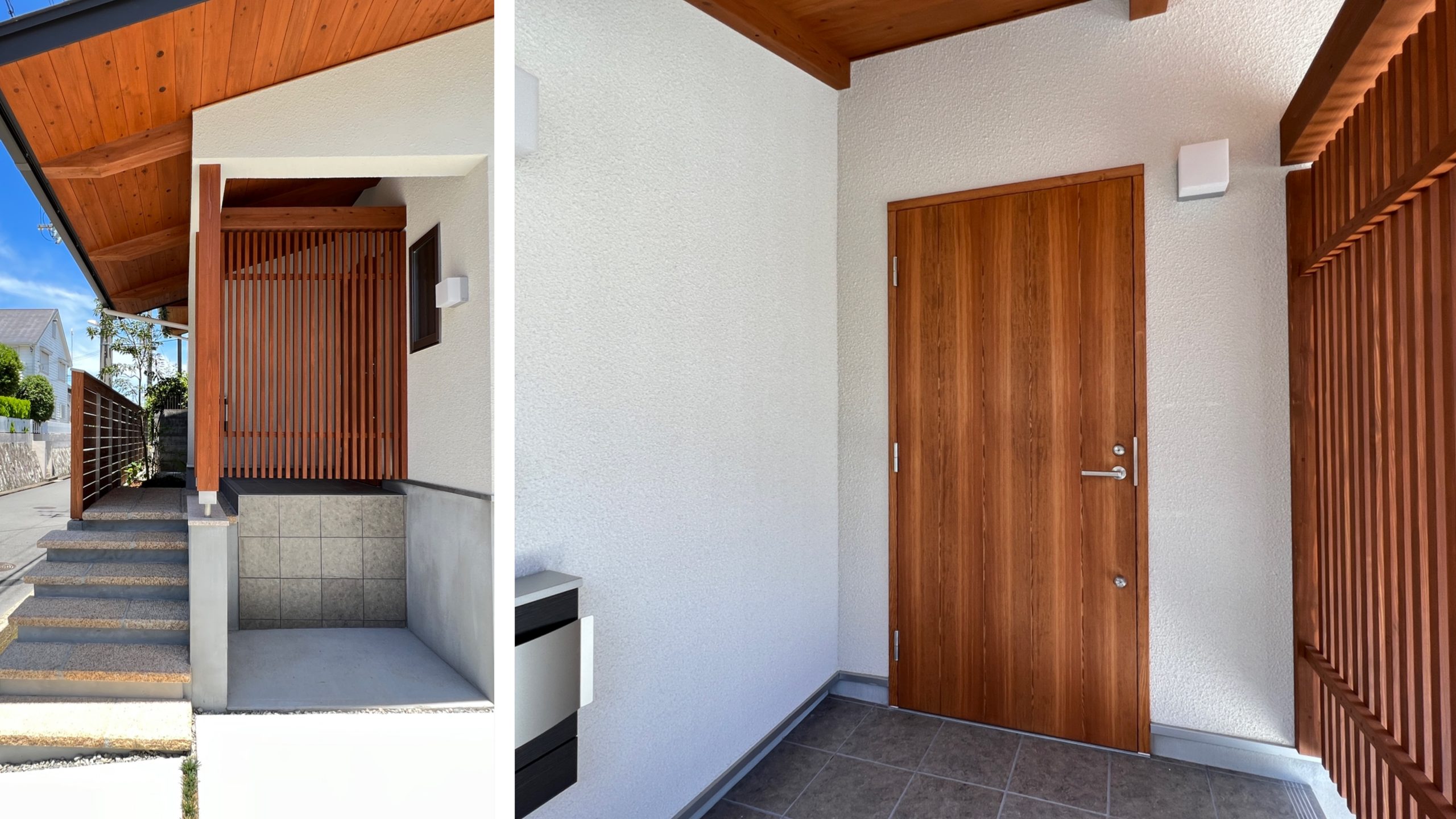 軒を深く出して玄関までのアプローチが濡れないように計画。