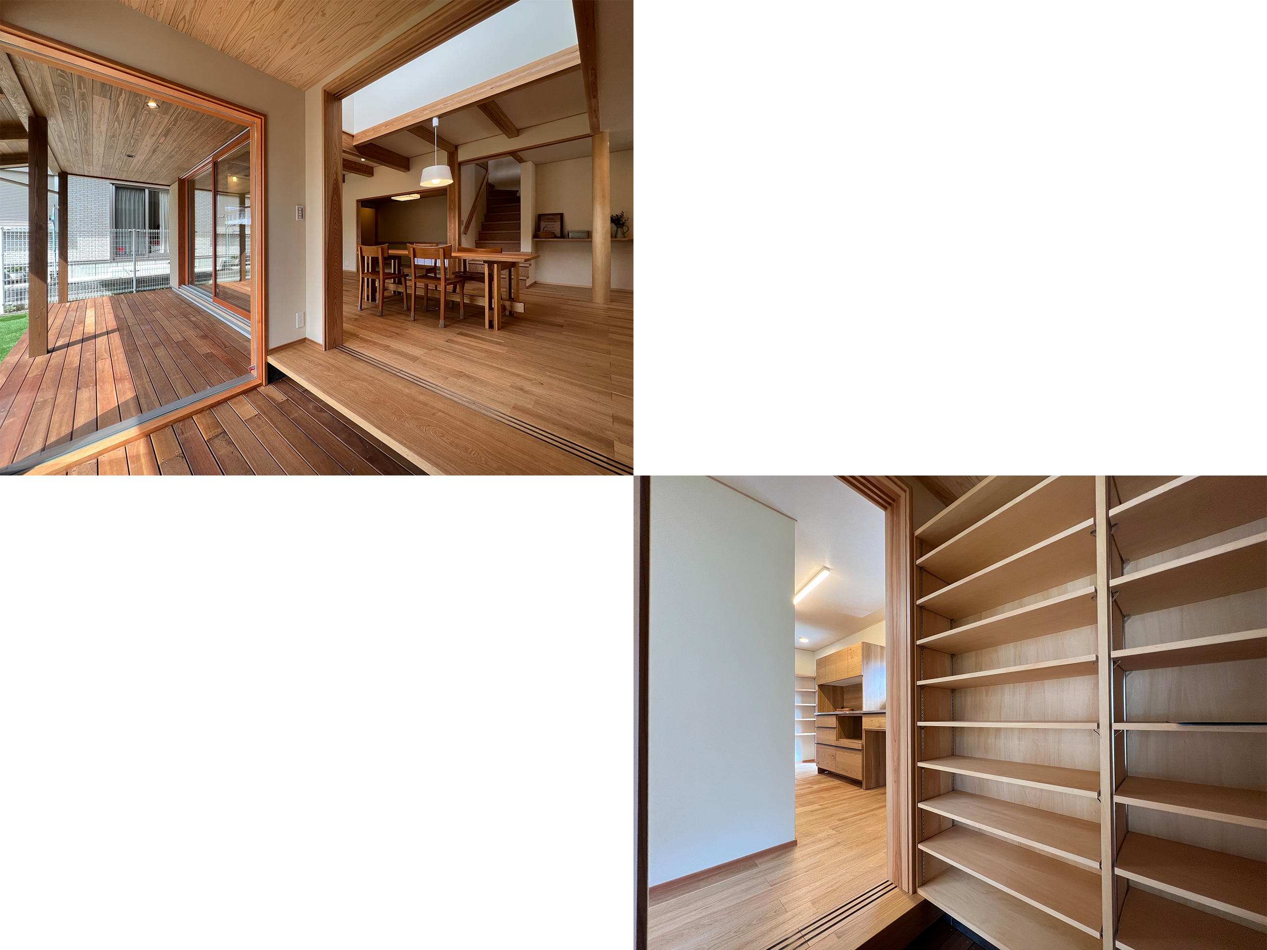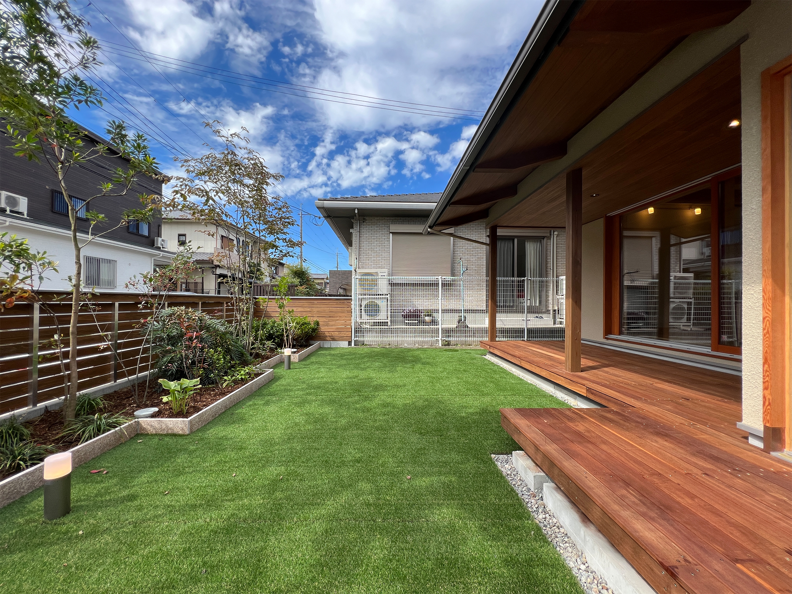 ウッドデッキ、お庭と繋がり広く使うことができます。