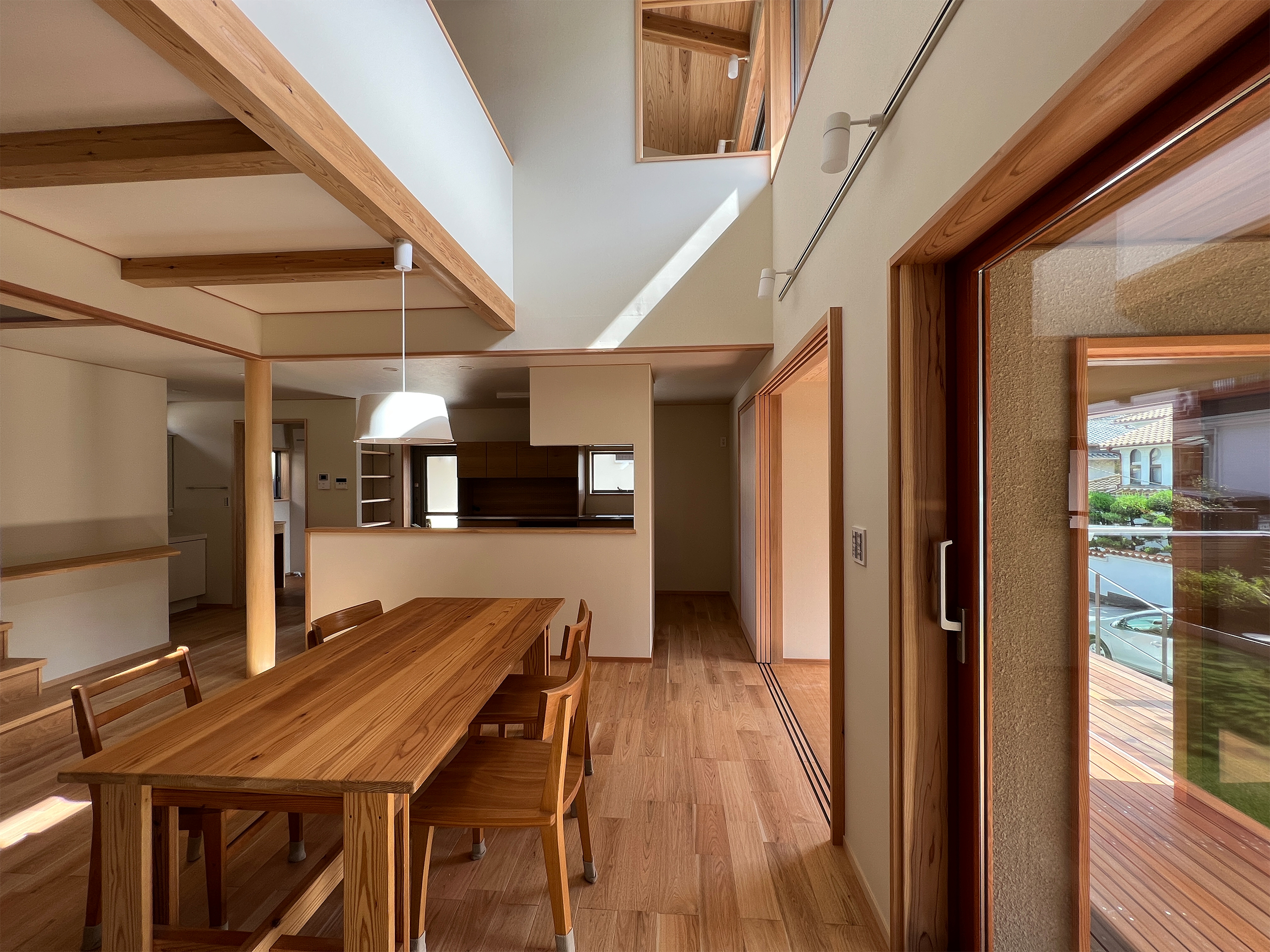 家族が集まるLDKは大きな窓と吹き抜けにより開放的な広がり間取りに。