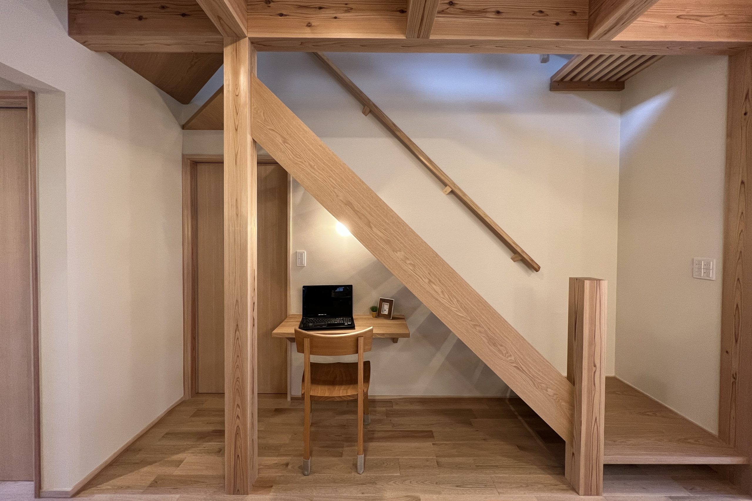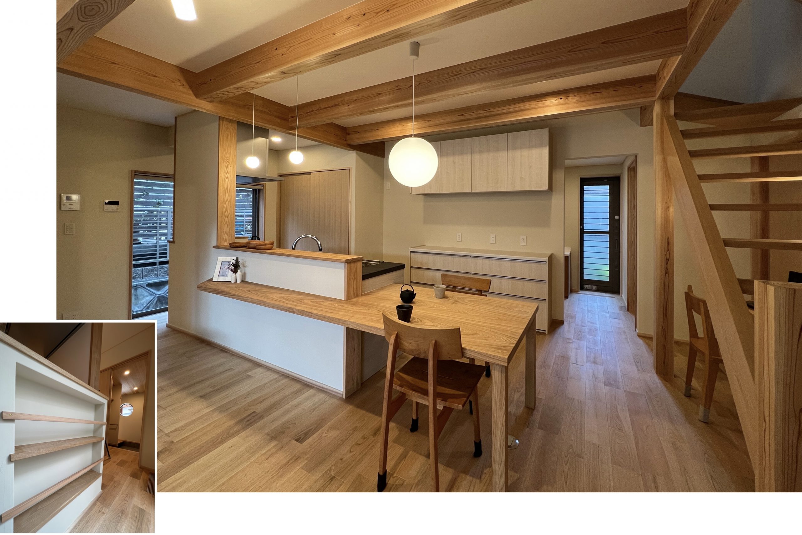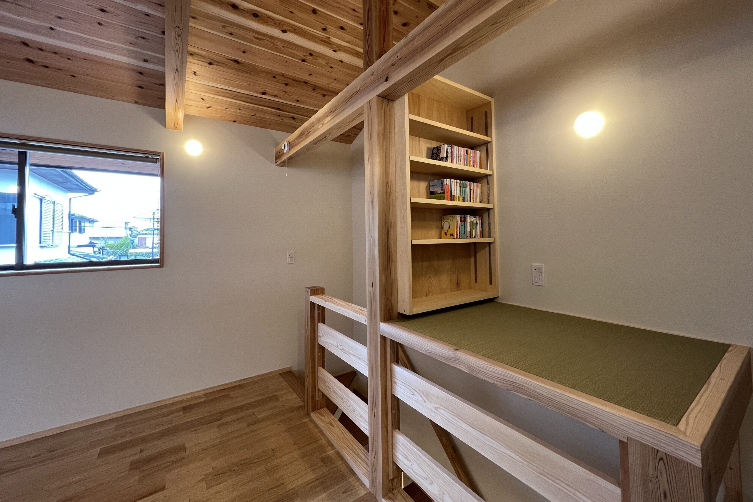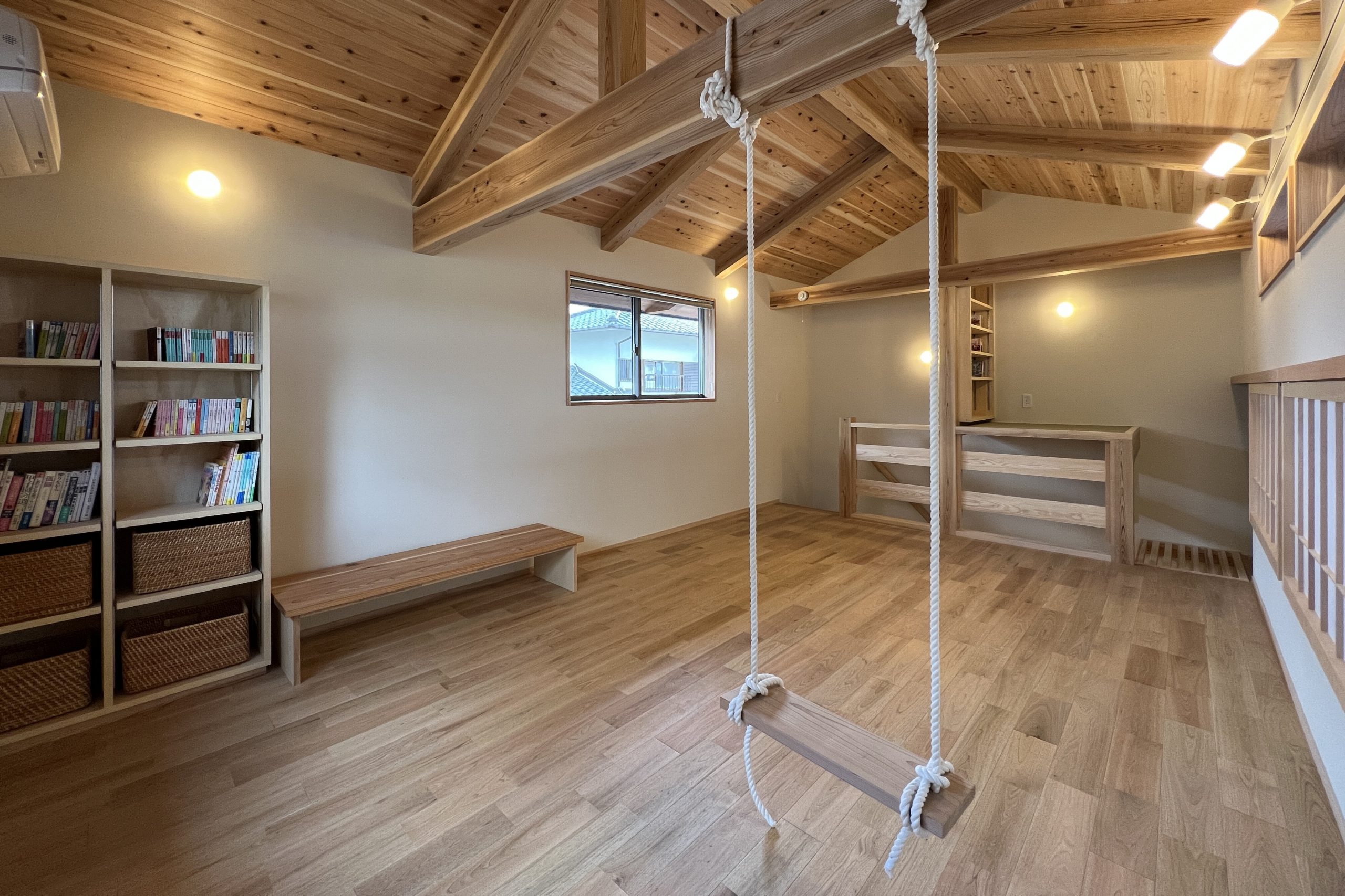 お嬢様家族が遊びに来た時のことを考え、キッチンは回遊できる間取りに。2階はお孫様が楽しく遊べる空間になっています。大きな吹抜けのある開放的なリビングに家族が集うお住まいです。