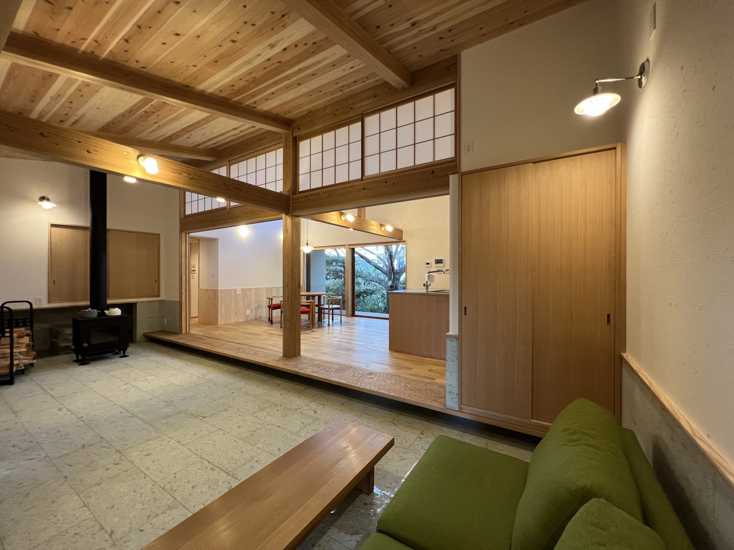 薪ストーブを設けた広い土間空間は自然と人が集う場所に。