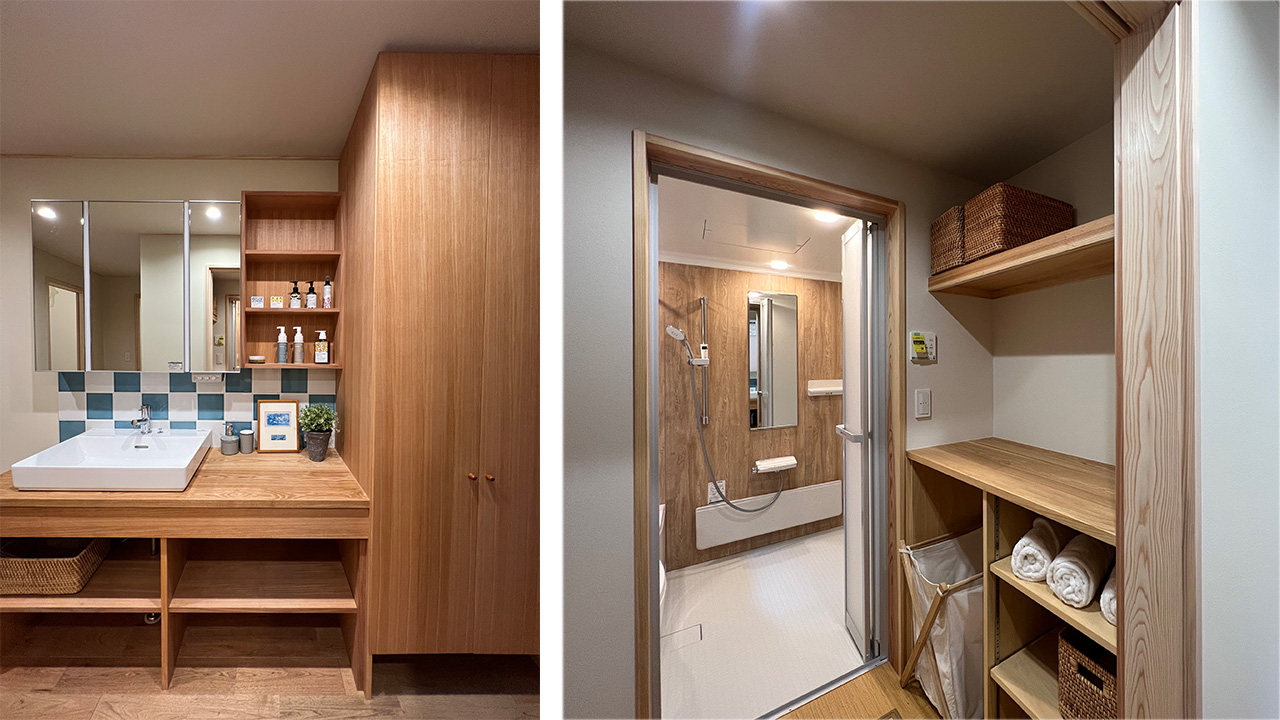 リビングの一角に設けた畳の書斎スペースからもお庭の景色を望むことができます。水廻りは一か所にまとめ、スペースを有効活用し収納も多く確保しました。