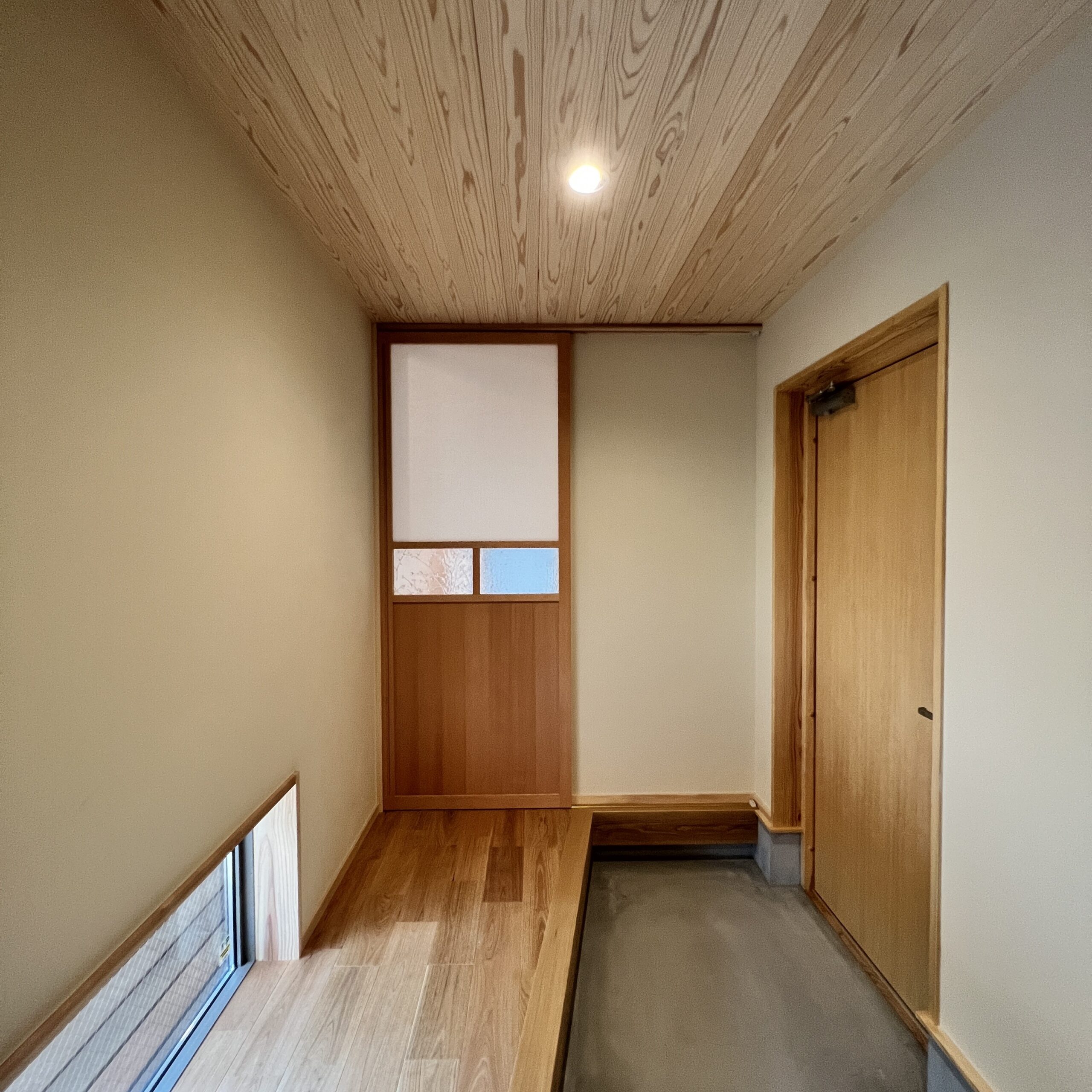 玄関を入ると奥さまこだわりの草花ガラスの建具がお出迎え。