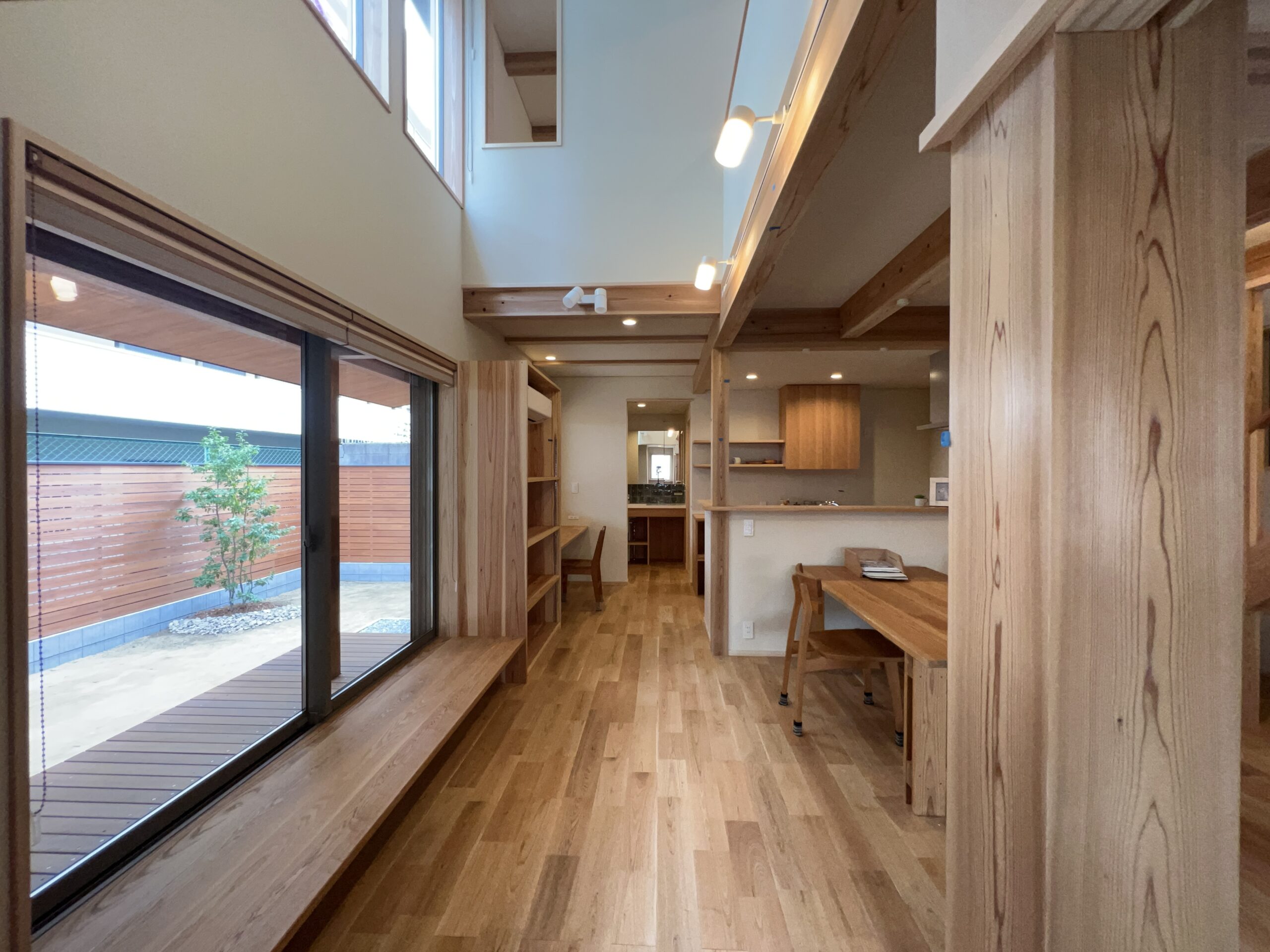吹抜けから光が降り注ぐリビングにはお庭を望むベンチを設けました。
