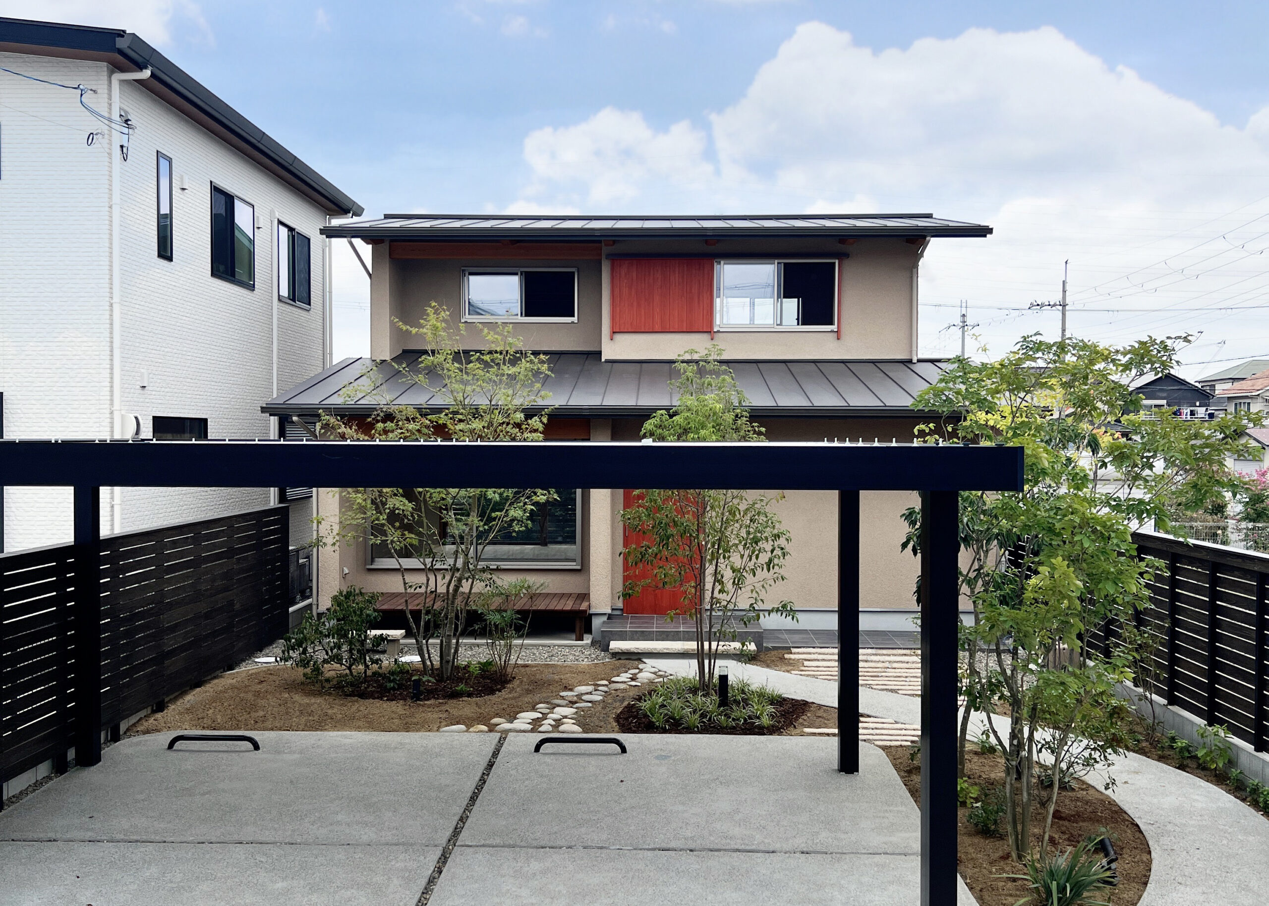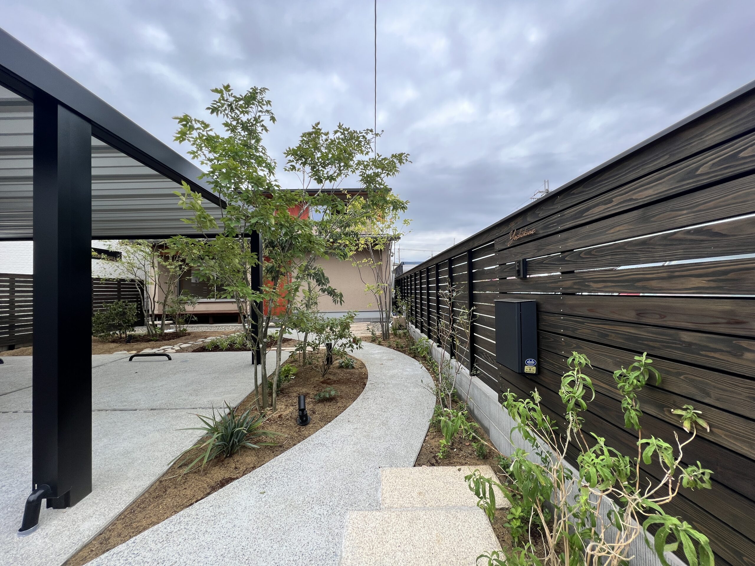 曲線のアプローチが玄関への道のりに趣を加え、目隠し効果も。