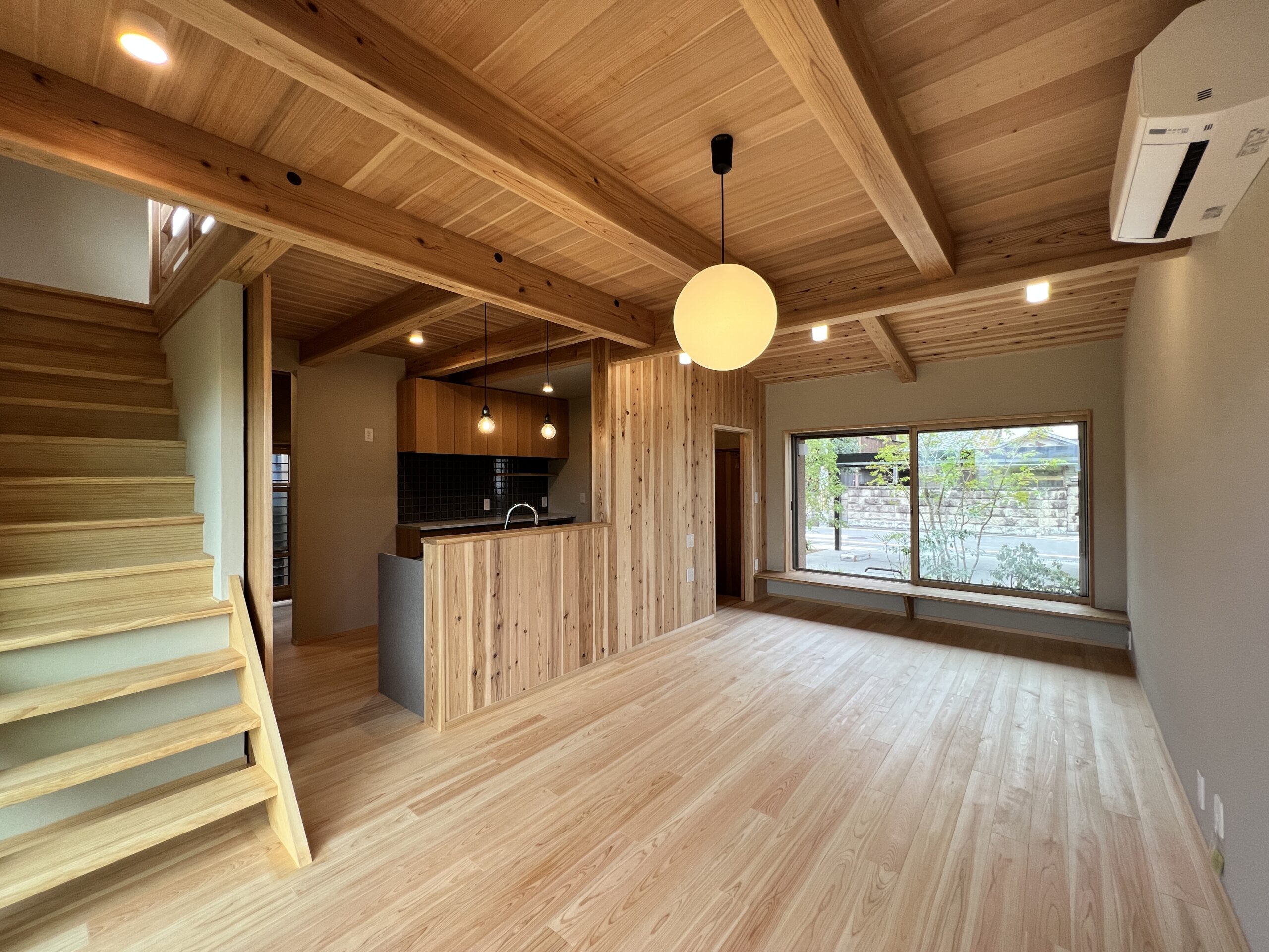 木のぬくもりに包まれるリビングは、車や外の景色を楽しめます。