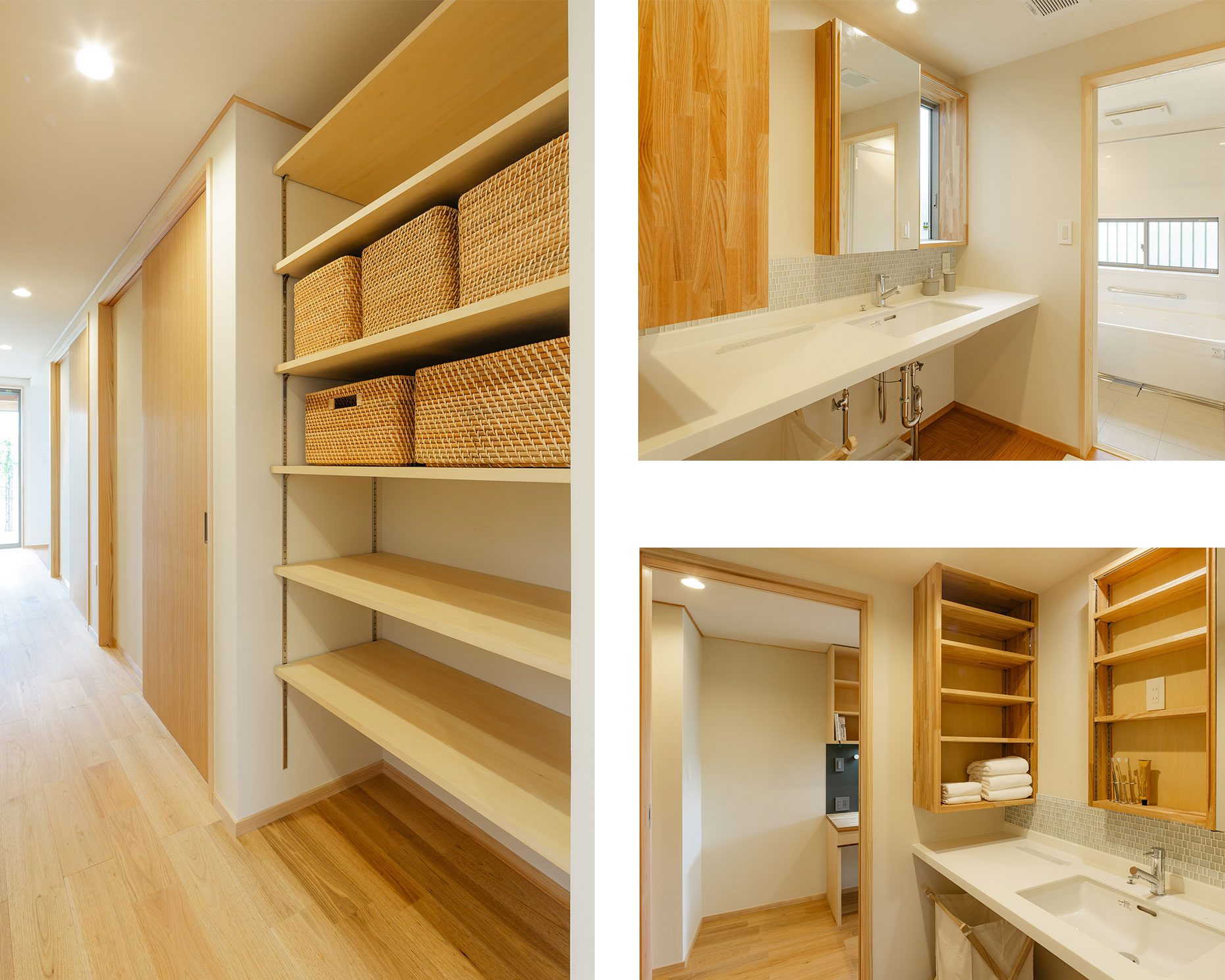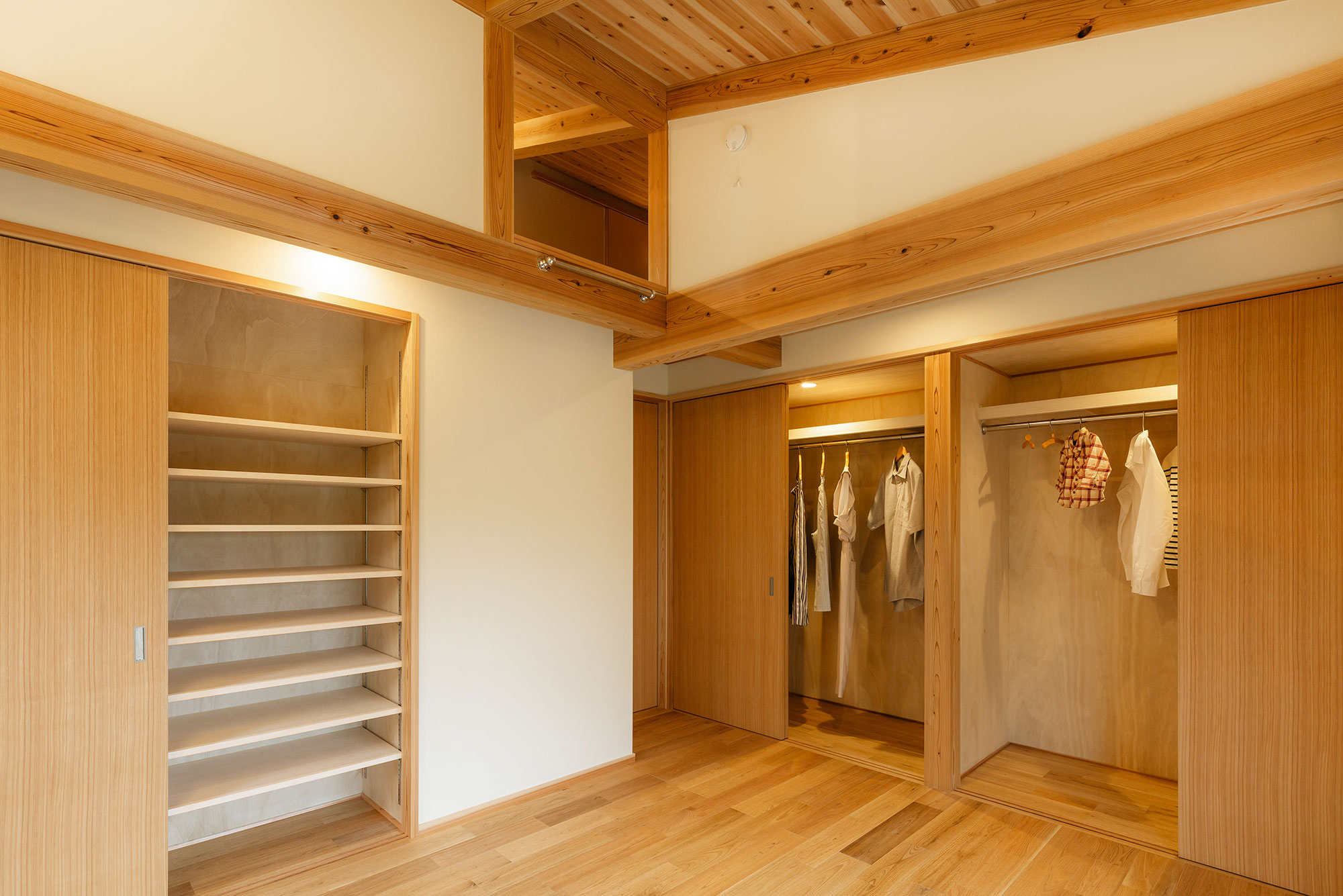 LDKの裏導線に寝室と水廻りがまとまった家事らく動線になっています。吹き抜けからは明るい光が降り注ぎ家族みんなが居心地よく永く住み続けられるお家になりました。