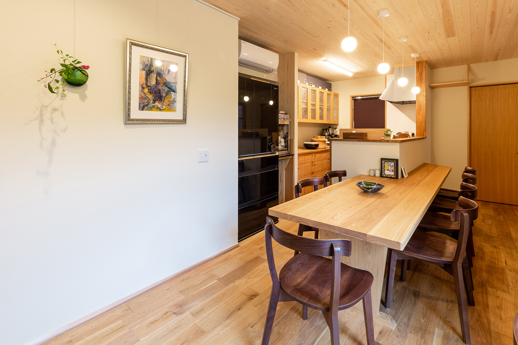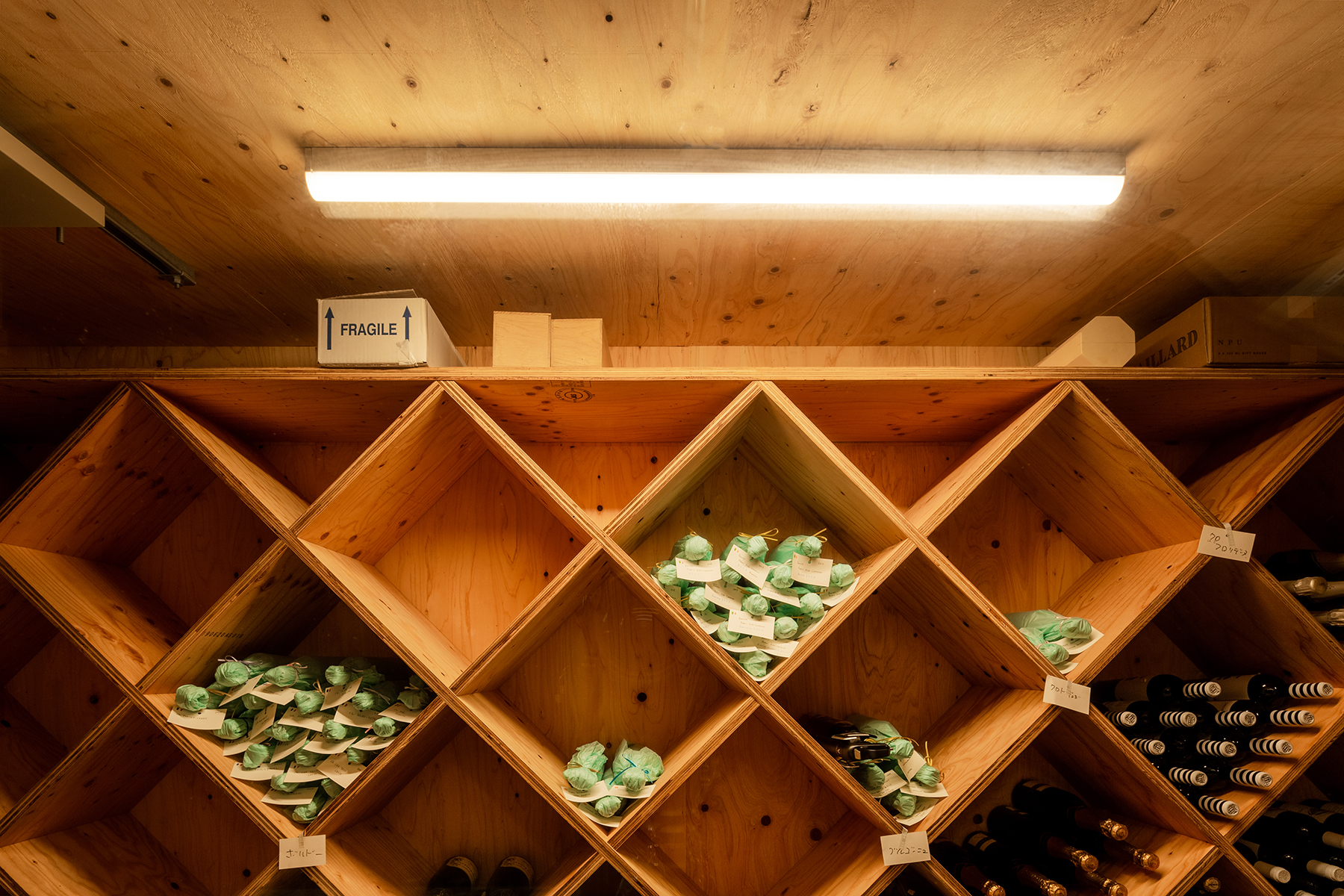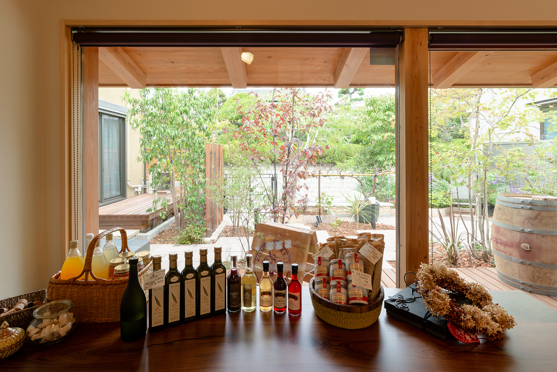 木立の中を抜けていくようなお家になりました。ガラス張りのワインセラー、試飲ができるスペースなど植栽とワインを楽しめるお家になりました。